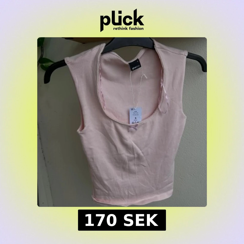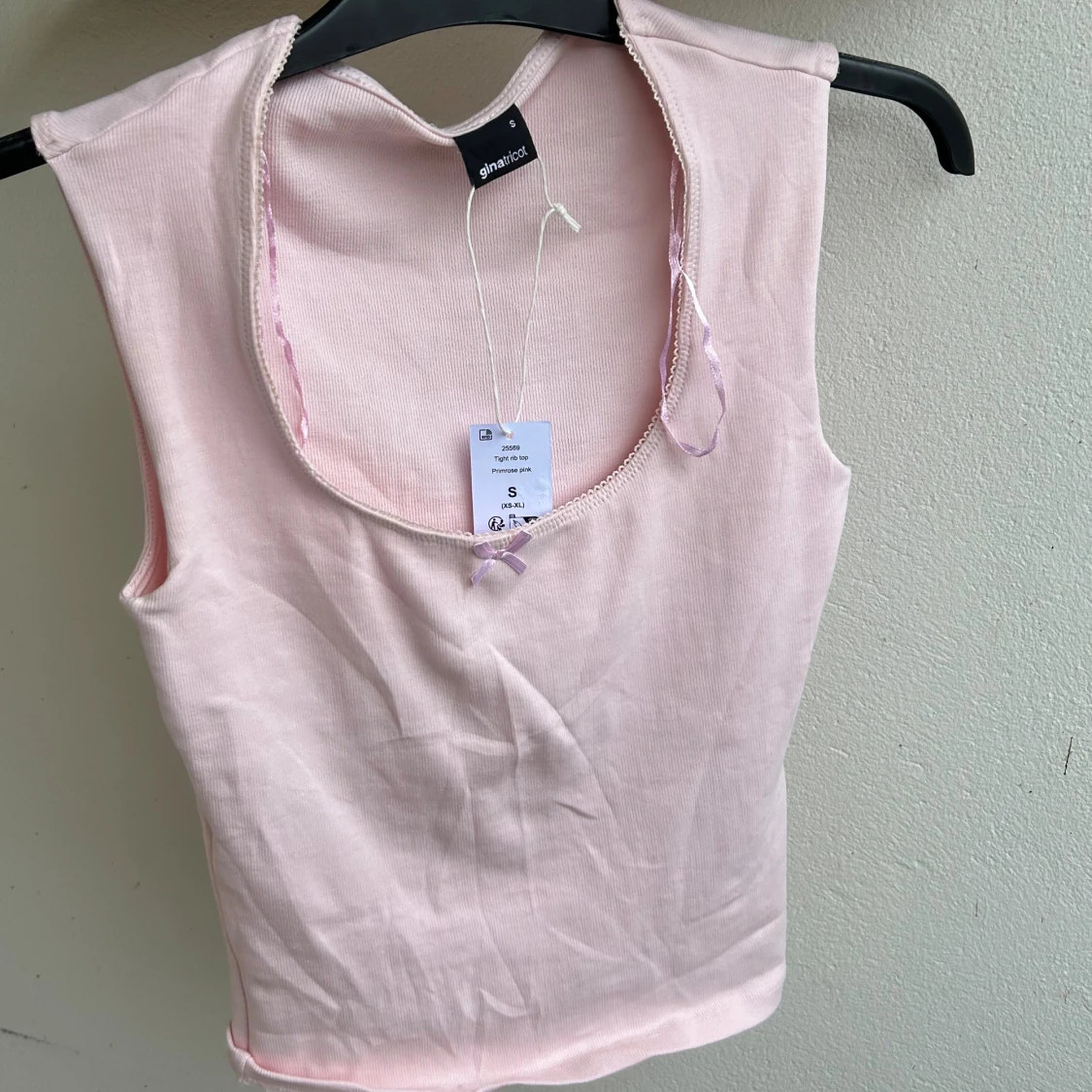 Supersöt ljusrosa topp som är ärmlös och rundad halsringning. Toppen har en liten rosett framtill och är gjord i mjuk bomull. (Orginalpriset är 179 men den är helt ny och prislappen kvar)