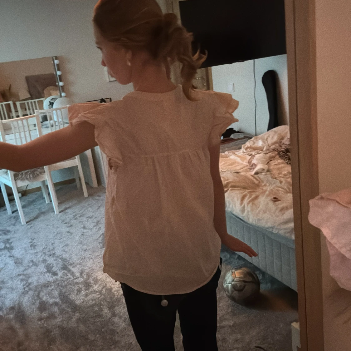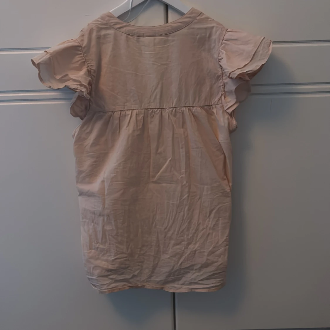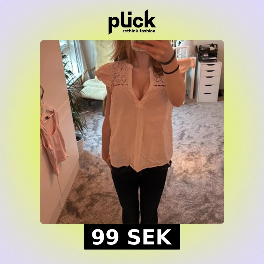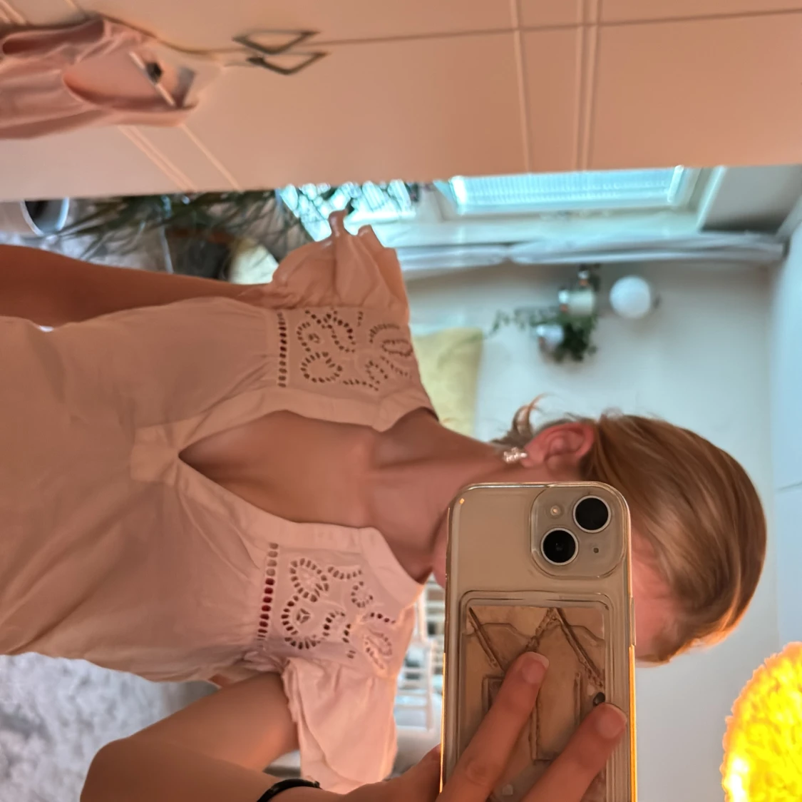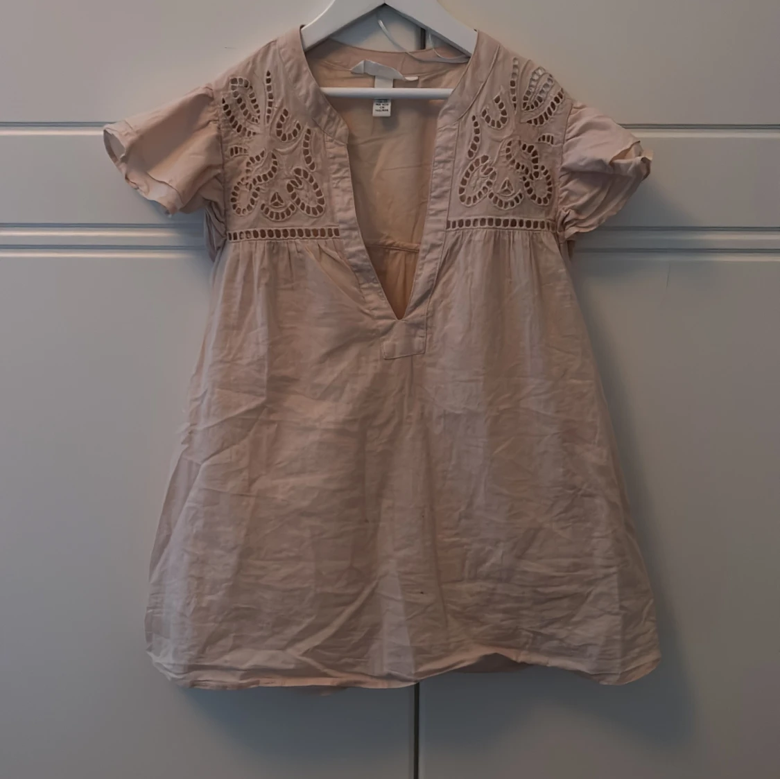 Supersöt ljusrosa blus från H&M med broderade detaljer upptill och djup v-ringning. Blusen har volangiga korta ärmar. Snygg och luftig passform. Nypris 199kr