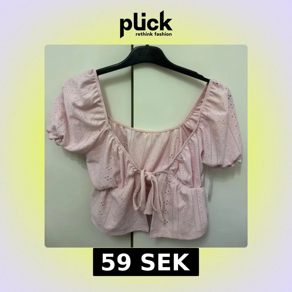 Supersöt ljusrosa blus med broderade hålmönster och puffiga korta ärmar. Toppen har en v-ringad skärning med knyt framtill och volangdetaljer som ger en romantisk vibe. Perfekt för dig som gillar pasteller och detaljer.
