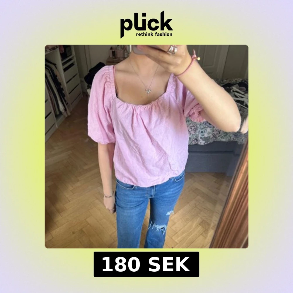 Säljer en ljusrosa blus med puffiga korta ärmar och söt broderad struktur. Blusen har en fyrkantig halsringning och är lätt croppad i modellen. Perfekt för dig som gillar romantiska och feminina detaljer. Superfin att styla med jeans eller kjol!