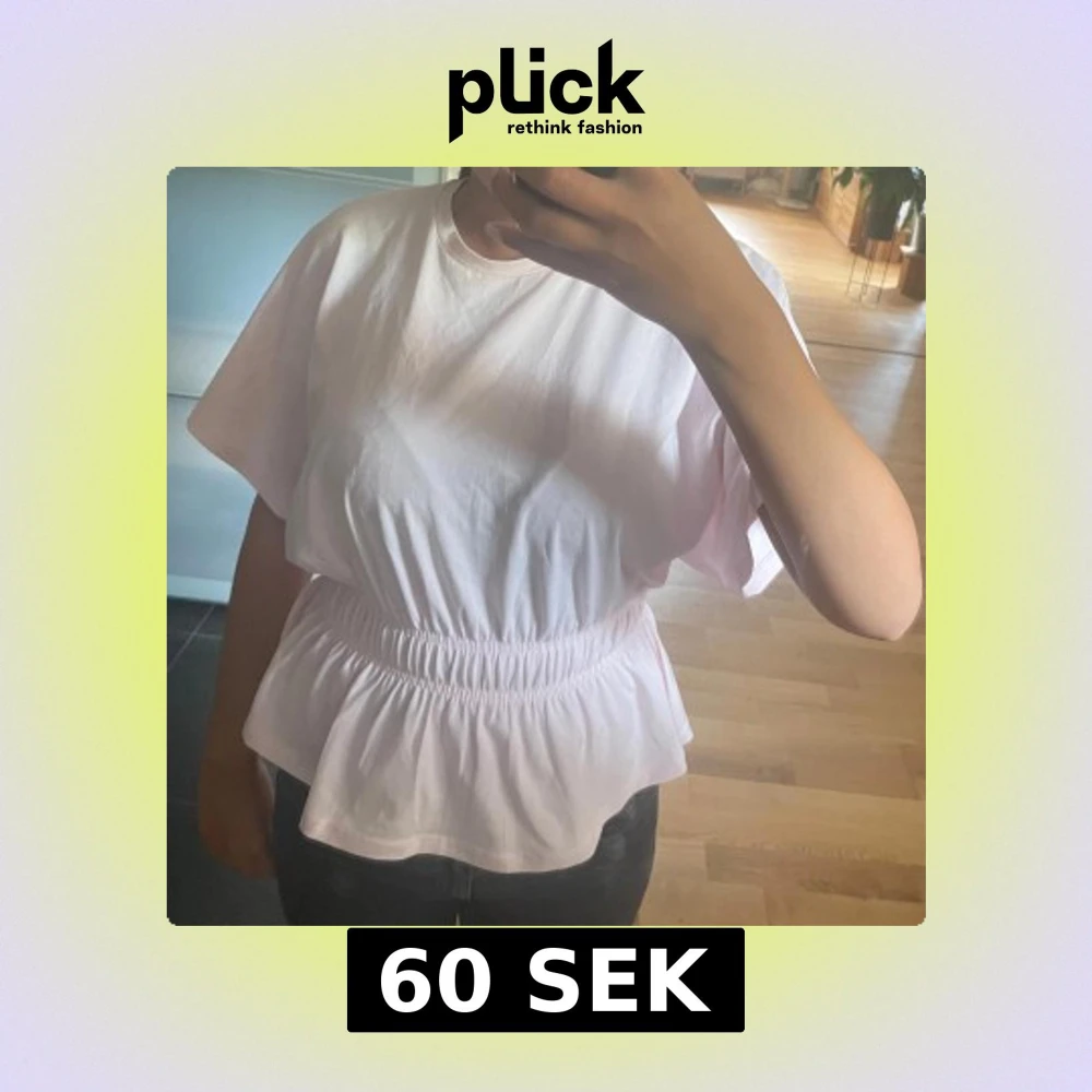Säljer en söt ljusrosa blus med korta, vida ärmar och markerad resår i midjan som ger en snygg volang-effekt. Toppen är i mjuk bomull och har en avslappnad passform som ändå framhäver midjan. Perfekt för dig som gillar en feminin och trendig look.