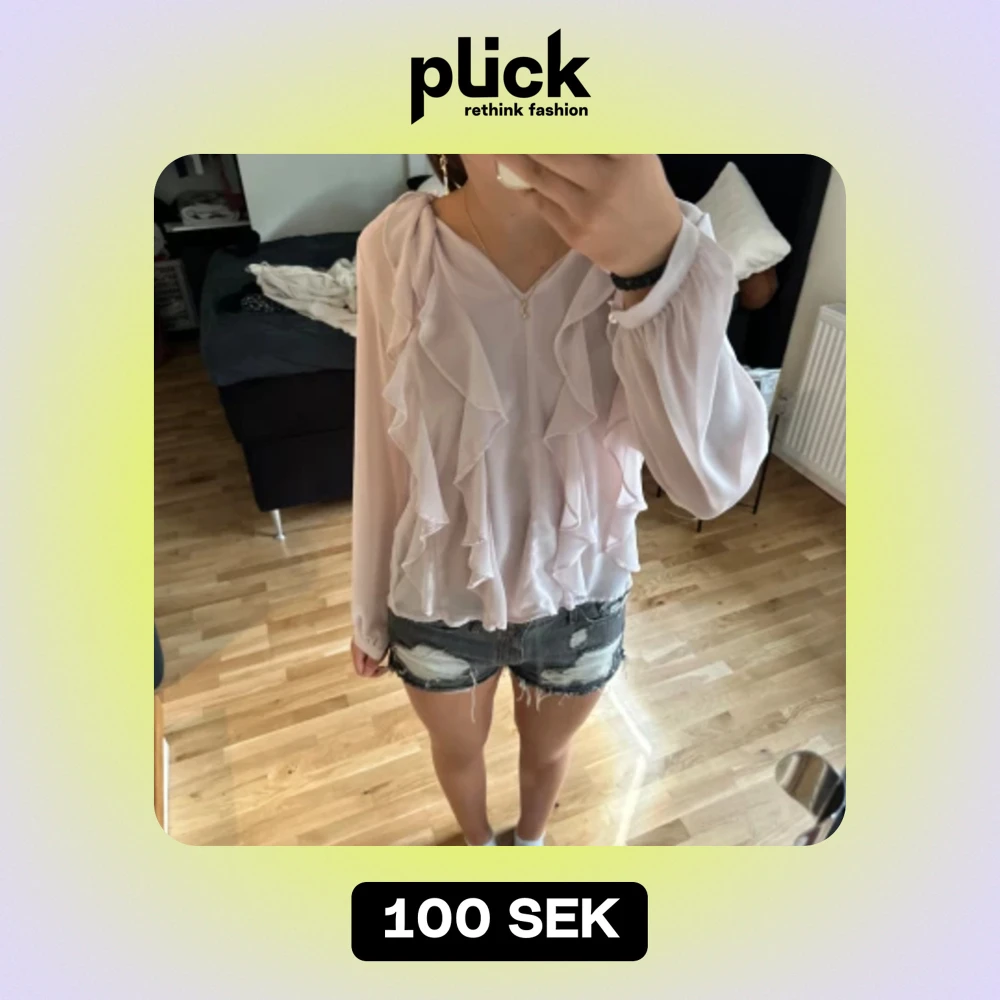 En elegant ljusrosa blus med volanger framtill och långa ärmar. Blusen har en lös passform och är tillverkad i ett lätt och luftigt material.