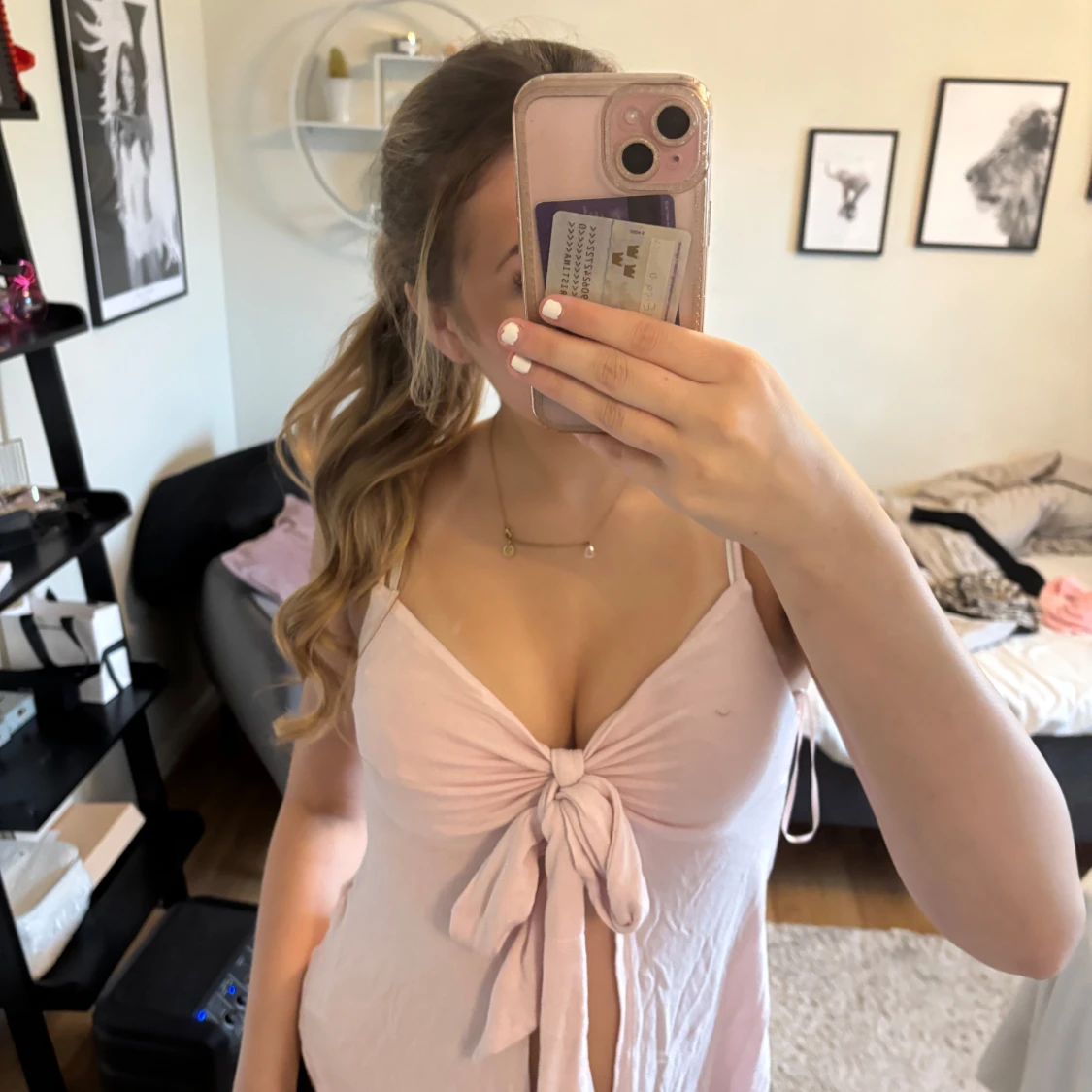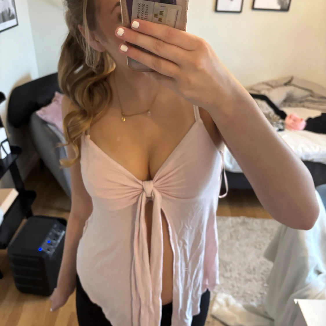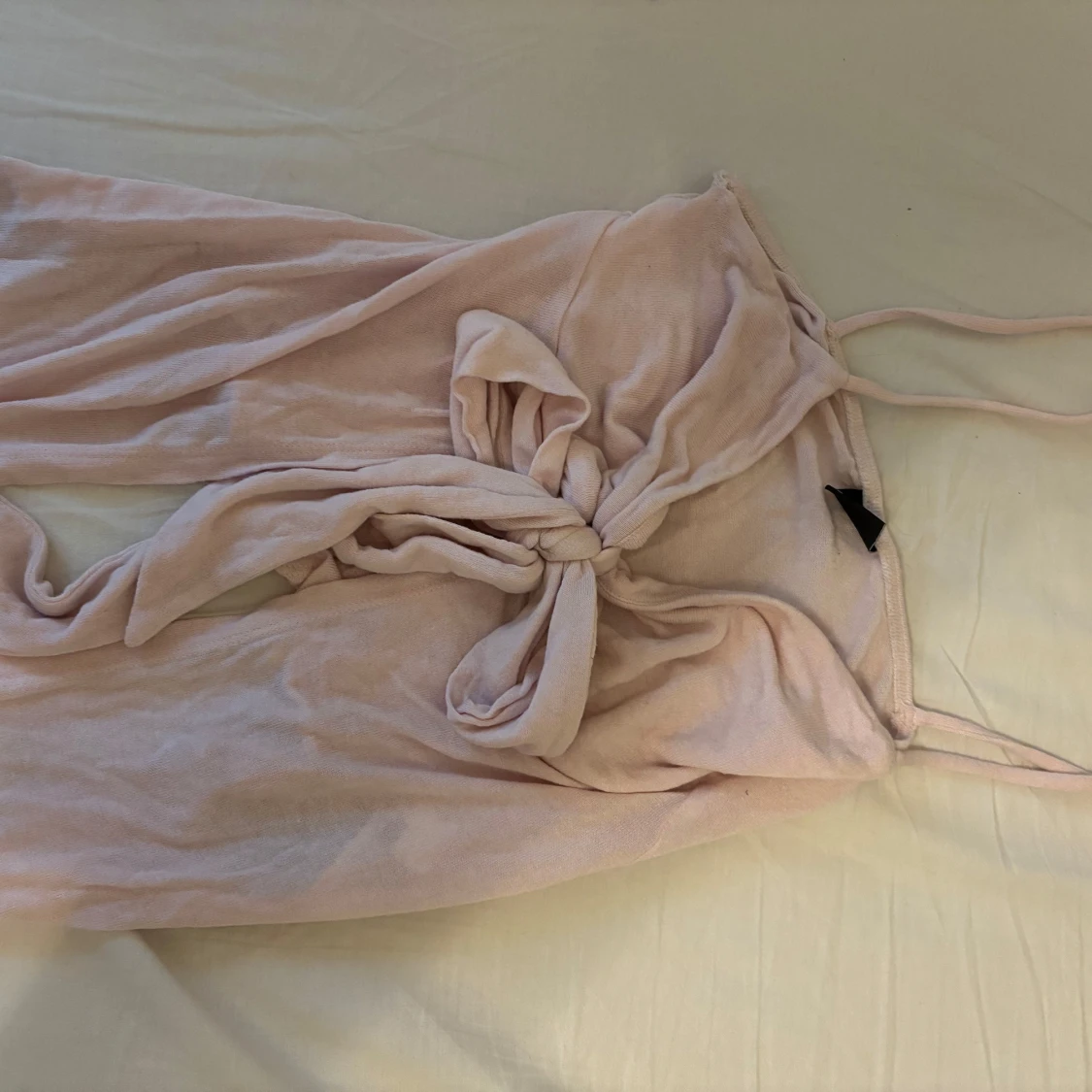 Säljer en ljusrosa croppad linnetopp med smala axelband och knyt framtill. Toppen har en v-ringad urringning och är tillverkad i ett mjukt, tunt material. Perfekt för varma dagar och enkel att styla.