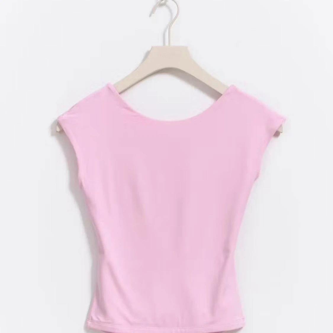 Säljer en ljusrosa croppad topp med öppen rygg och korta ärmar. Toppen har en clean och enkel design med mjukt stretchigt material som sitter tight mot kroppen. Nypris är 299