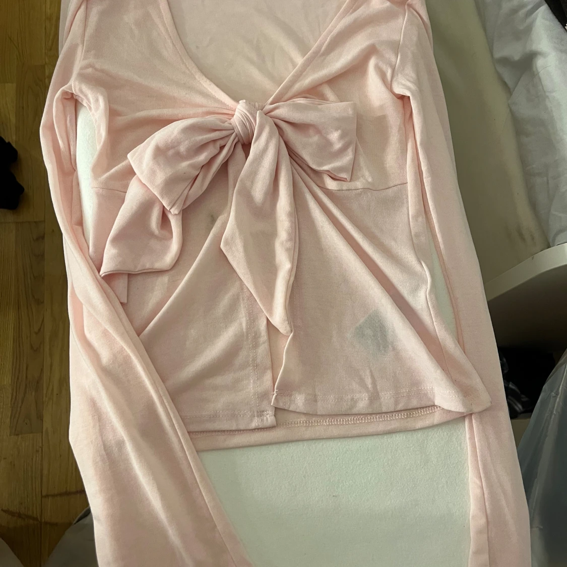 Supersöt ljusrosa knyttop från Gina Tricot i storlek XS. Toppen har lång ärm, djup v-ringning och en stor rosett framtill som knyts. Materialet är mjukt och tunt, troligen bomull eller polyester. Endast använd en gång.