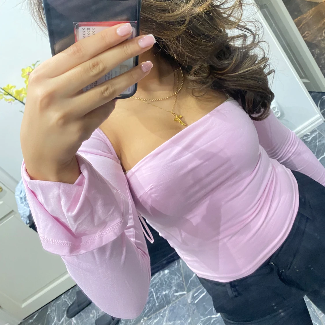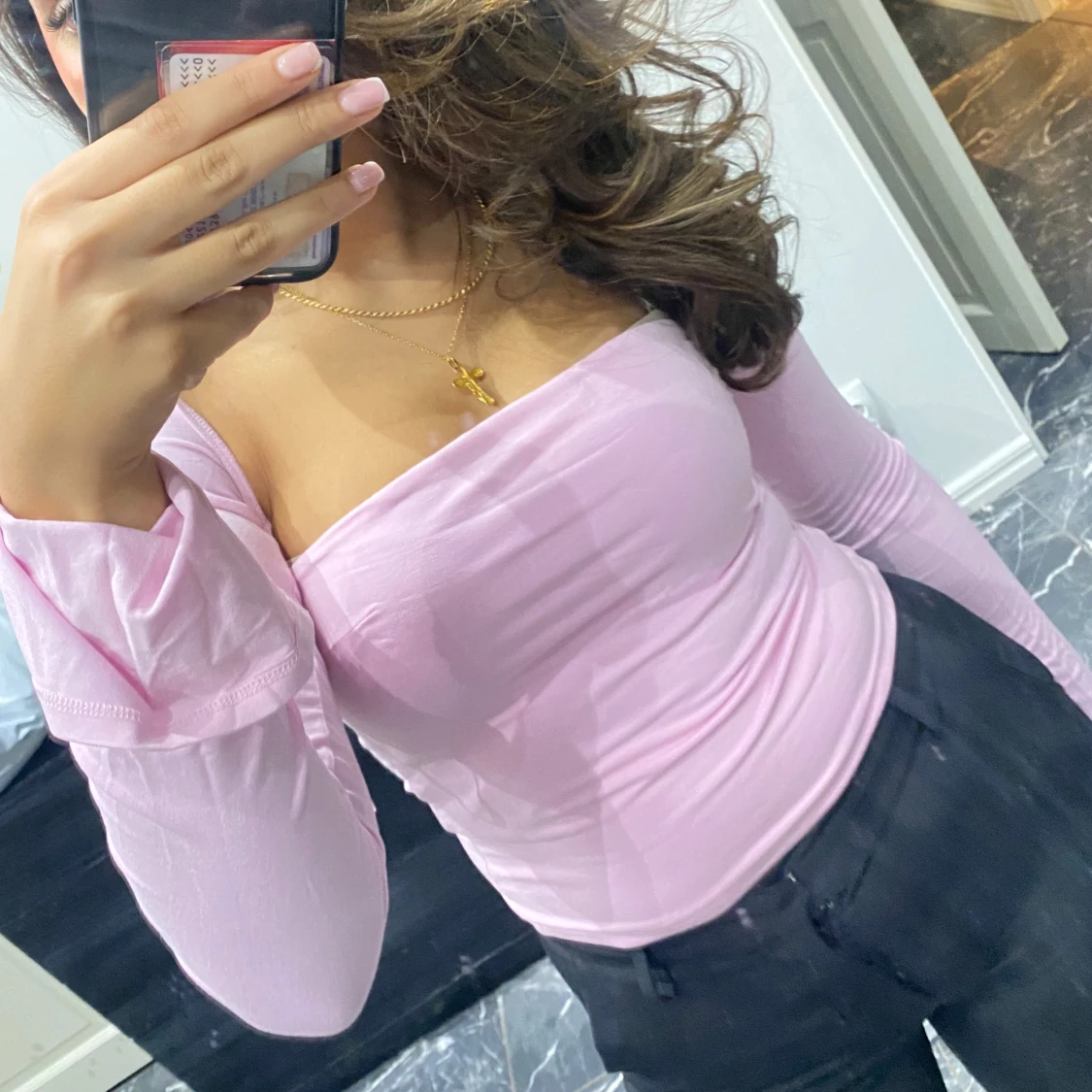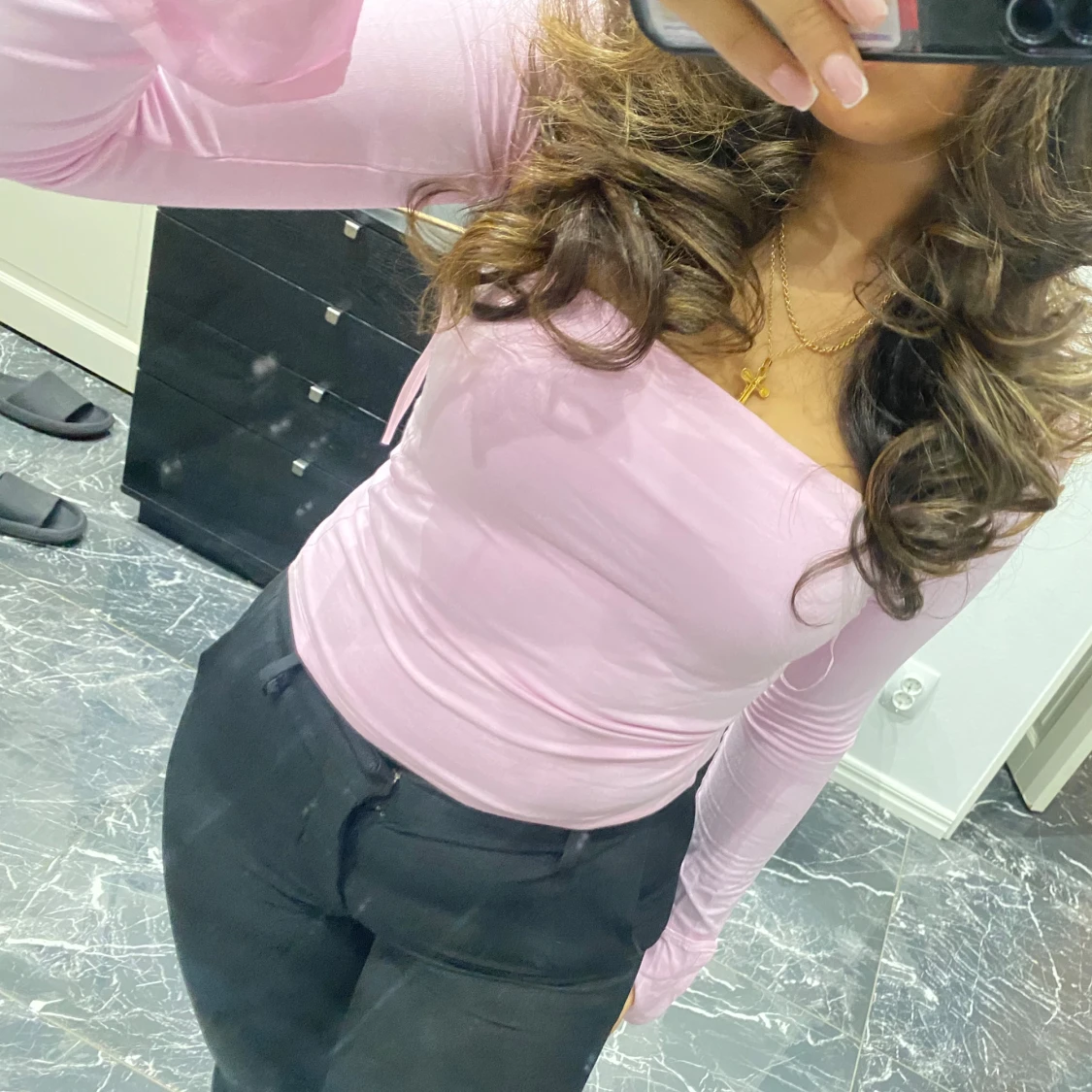 Säljer en ljusrosa, figurnära offshoulder topp med långa ärmar. Toppen har en clean och stilren look med slät yta och stretchigt material som sitter snyggt mot kroppen. Perfekt för dig som gillar en feminin vibe och vill sticka ut med en enkel men trendig färg.
