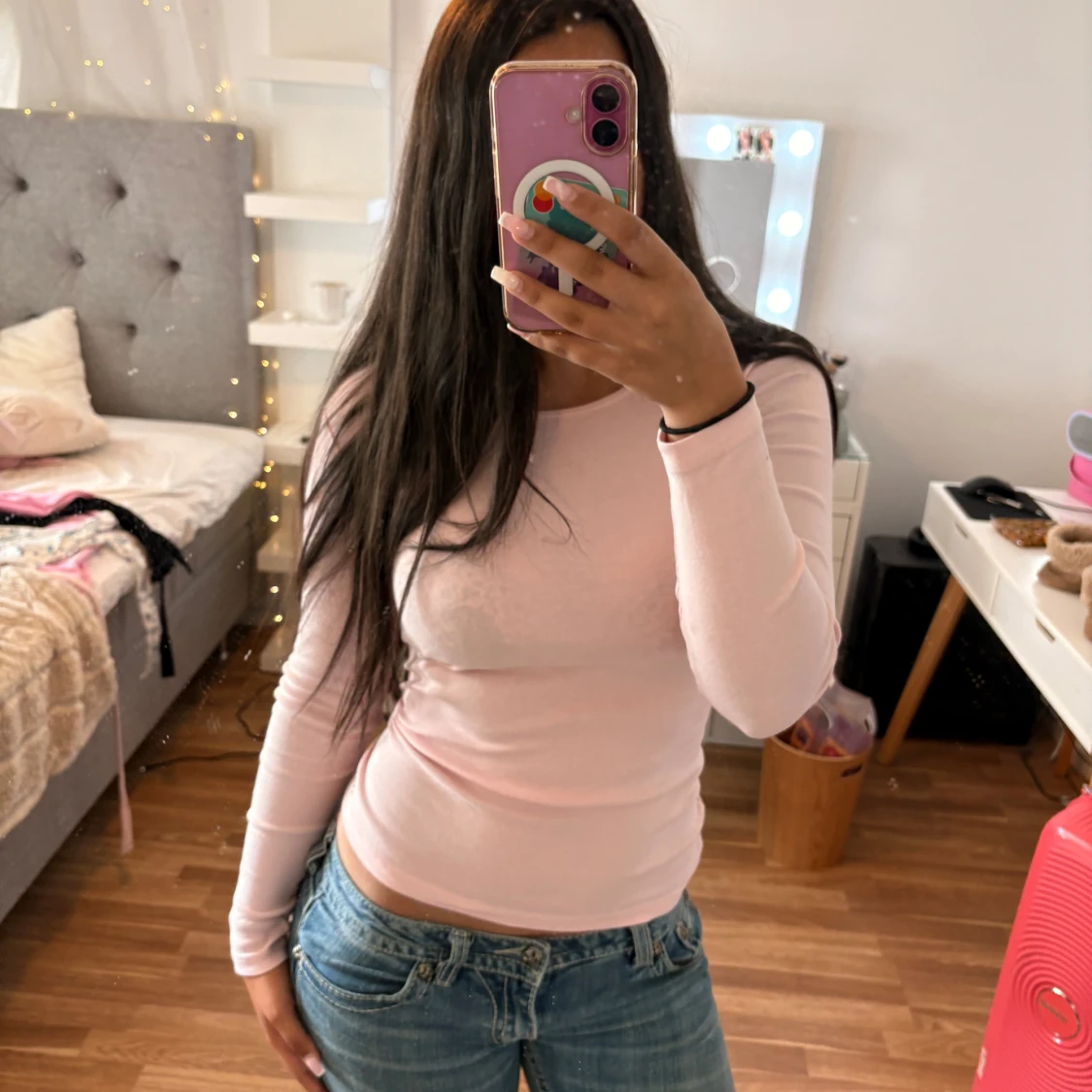 Säljer en ljusrosa långärmad topp från EP Collection. Modellen är tight och har en klassisk rund halsringning. Perfekt att styla med jeans eller kjol för en clean look. Materialet är mjukt och stretchigt, troligtvis bomull.