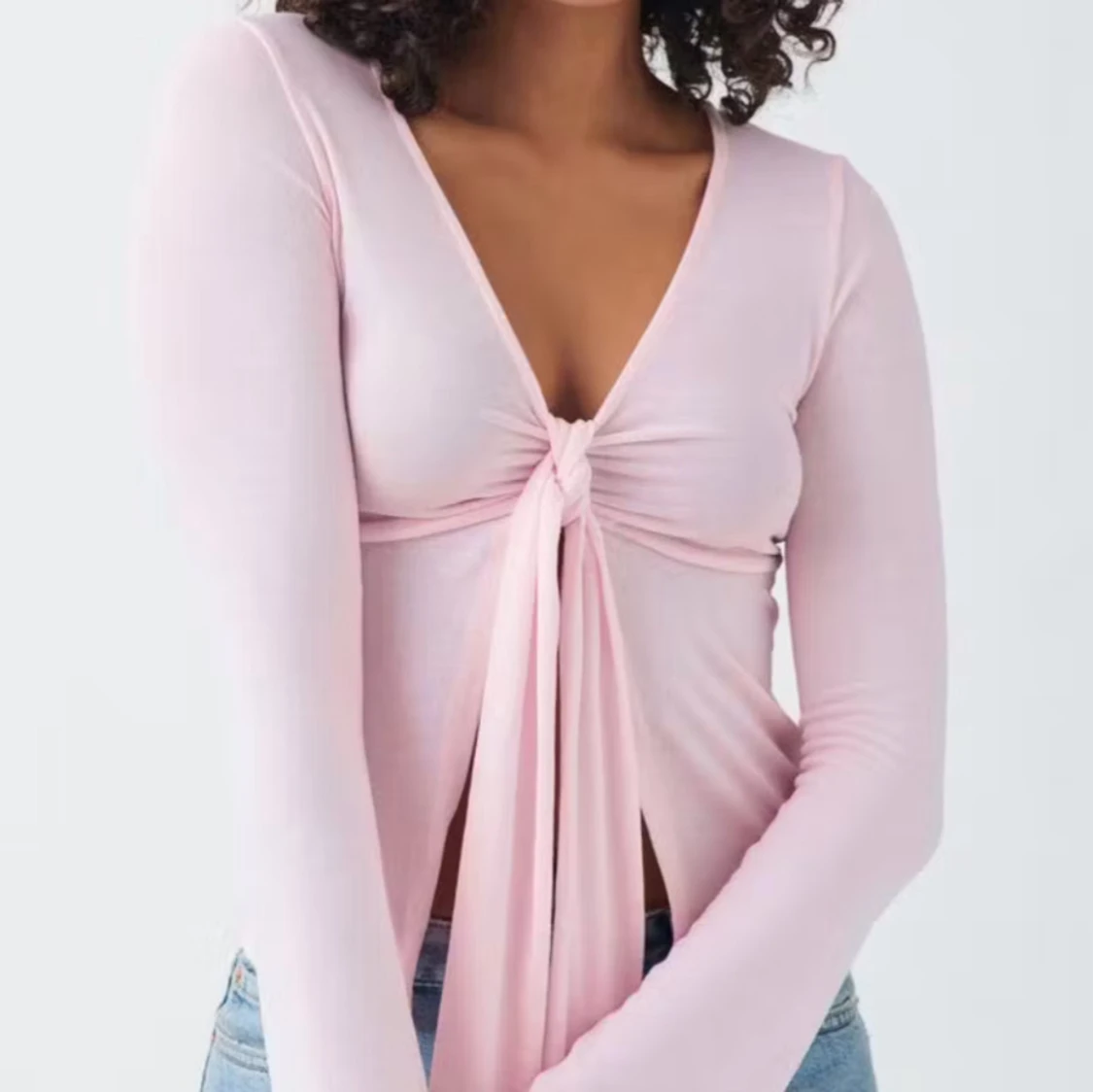 Supersöt ljusrosa topp från Gina Tricot med lång ärm och djup v-ringning. Toppen har en snygg knyt-detalj framtill som ger en feminin och trendig look. Använd några gånger, lite nopprig!🩷köpt för 300 kr.