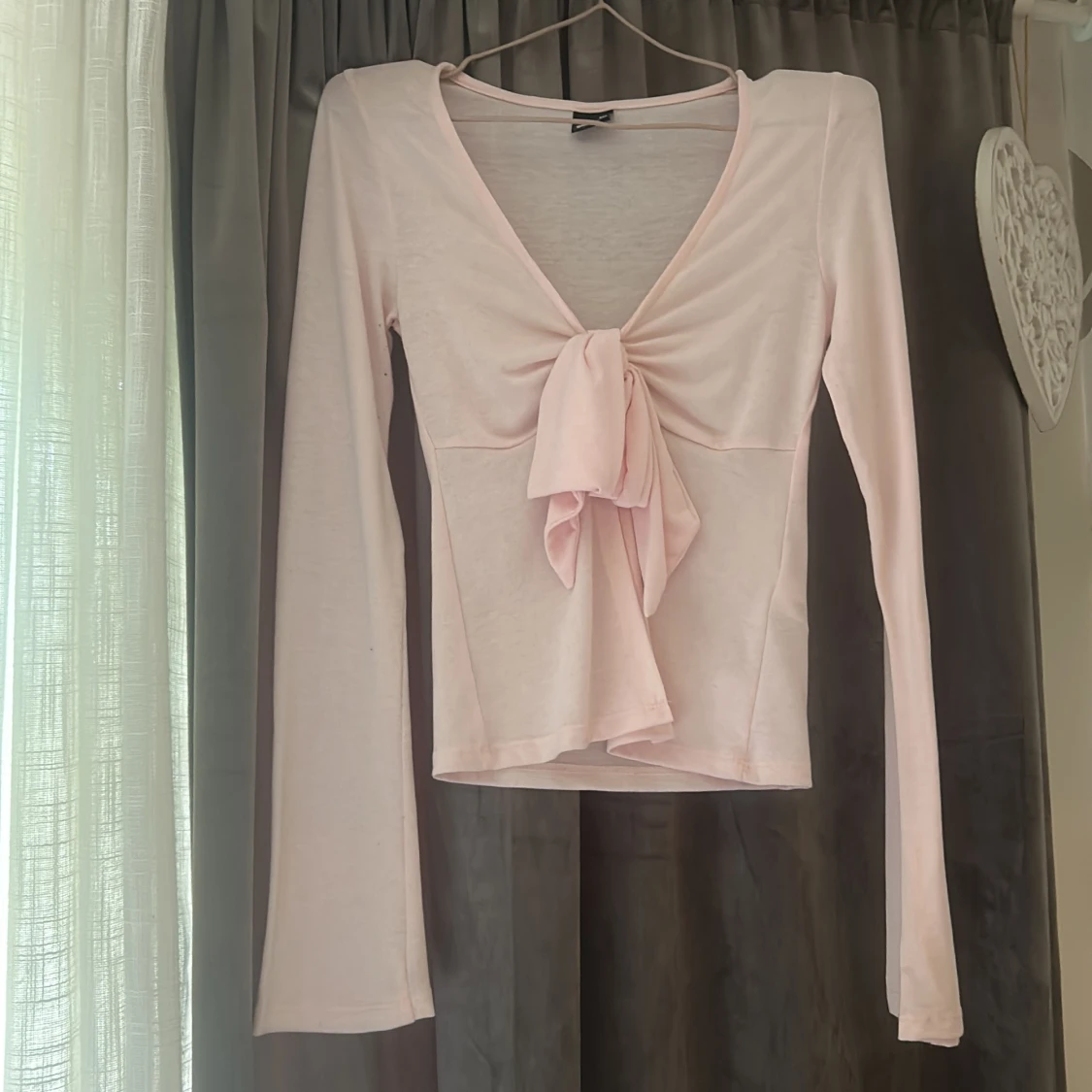 Supersöt ljusrosa långärmad topp med v-ringning och knyt framtill. Tunn och mjuk i materialet, Snygg passform och enkel att styla med både jeans och kjol.💕