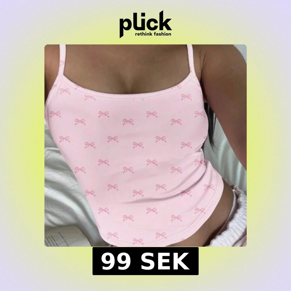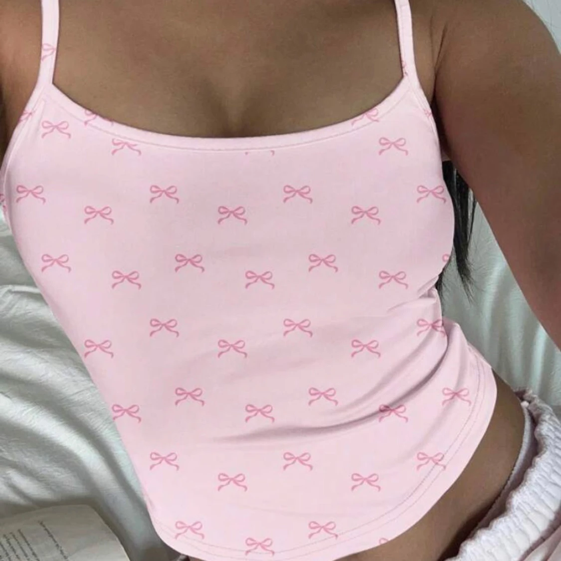 Söt ljusrosa linnetopp med tunna axelband och små rosa rosetter som mönster över hela toppen. Perfekt för varma dagar eller som ett lager under en kofta.
