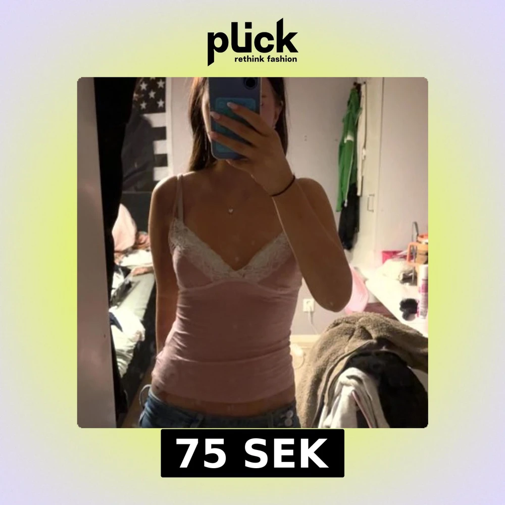 Säljer en ljusrosa linnetopp med tunna axelband och vit spetsdetalj längs urringningen. Toppen är croppad och har en feminin v-ringad form. Perfekt för varma dagar eller att styla lager på lager.