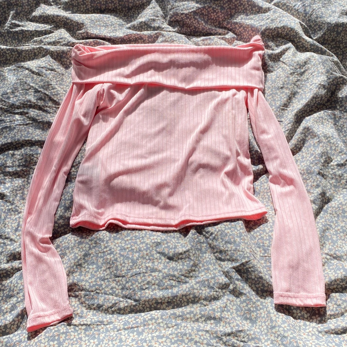 Säljer en ljusrosa offshoulder topp med långa ärmar. Toppen är ribbad och har en snygg, bred kant upptill som vilar över axlarna. Perfekt för dig som gillar en feminin och trendig stil. Materialet känns mjukt och stretchigt.