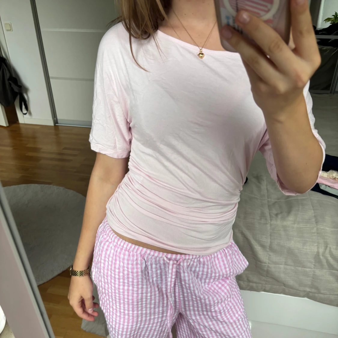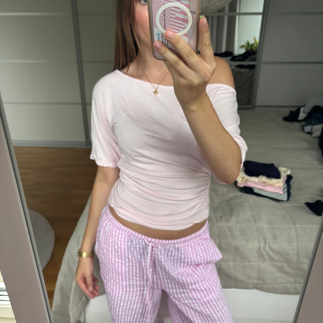 Säljer en ljusrosa topp med offshoulder-design och korta ärmar. Toppen är figurnära och har en lätt rynkad effekt i midjan. Perfekt för dig som gillar en enkel men trendig stil.