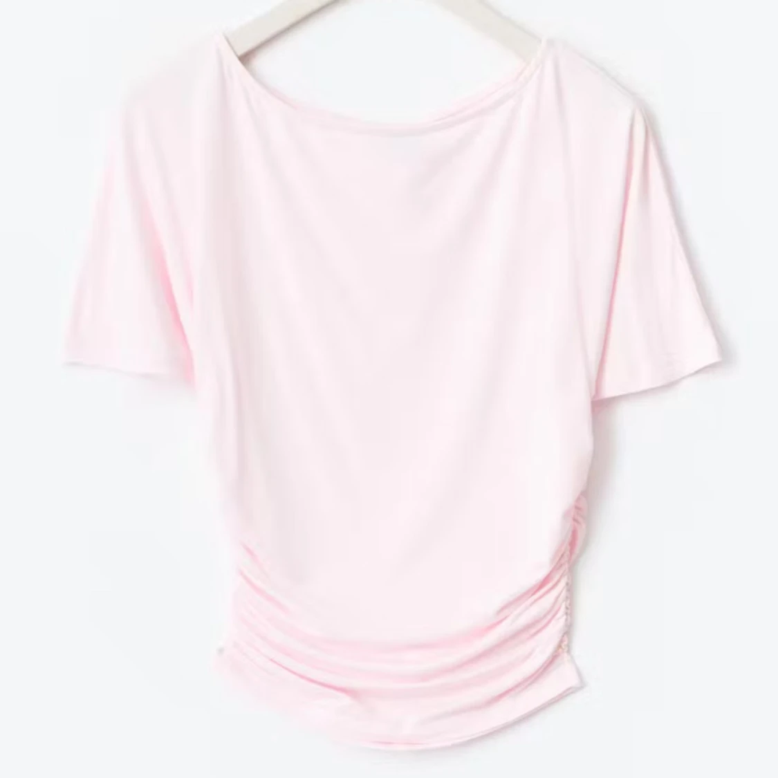 Supersöt ljusrosa topp från Gina Tricot med offshoulder-skärning och korta ärmar. Toppen har rynkade detaljer i midjan som ger en snygg passform. Perfekt till jeans eller kjol för en fräsch look.storlek S 💖