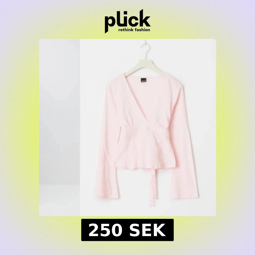Supersöt ljusrosa omlottopp med v-ringning och långa ärmar. Toppen har knytband i midjan som knyts baktill för en snygg passform. Perfekt att styla med jeans eller kjol för en trendig look.