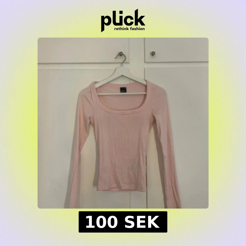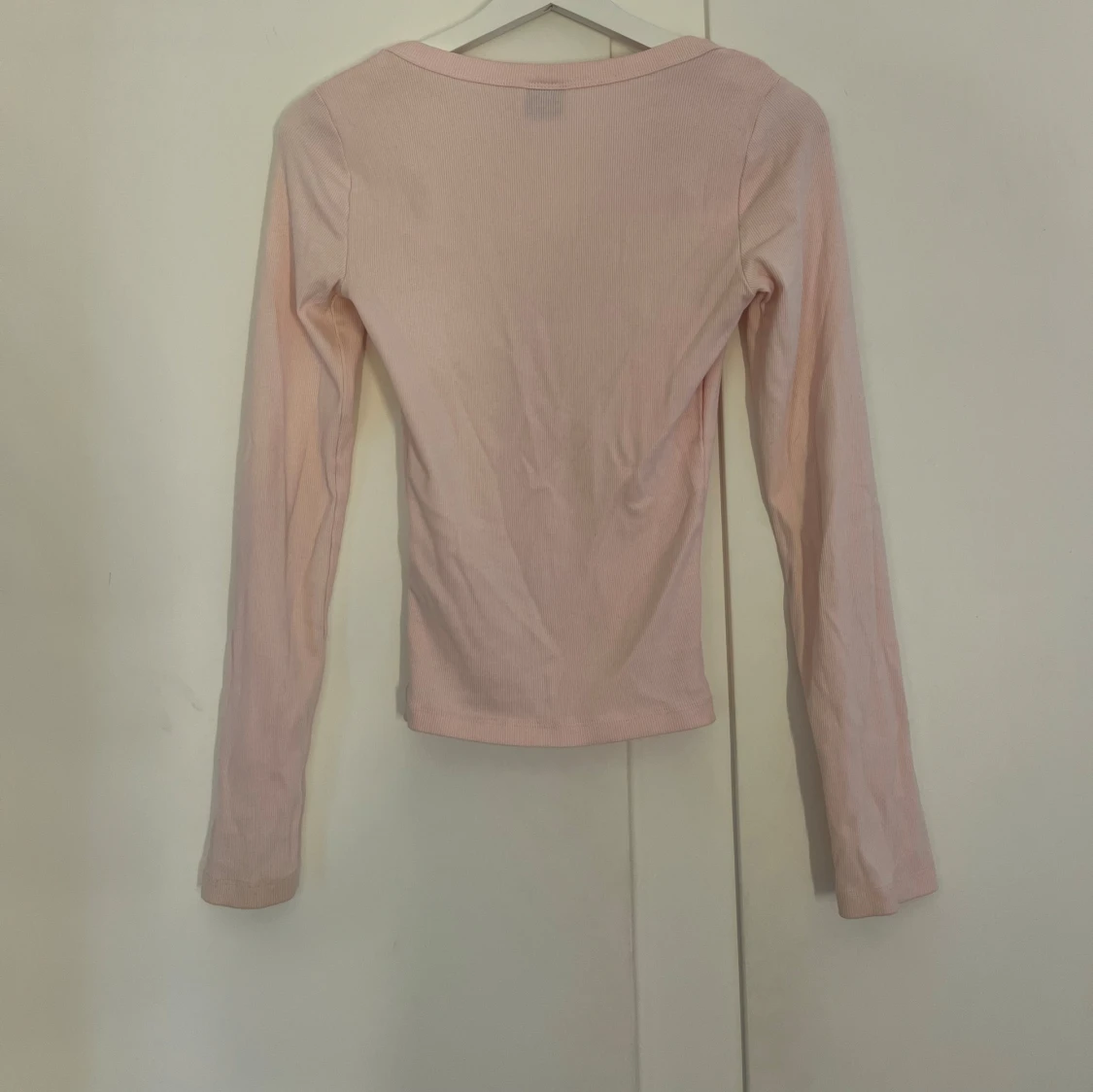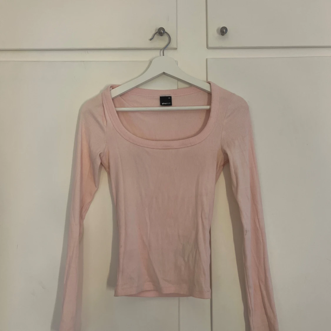 Ljusrosa långärmad topp från Gina Tricot med ribbad struktur och fyrkantig ringning. Toppen är figurnära och har en enkel, stilren design som passar perfekt till jeans eller kjol.