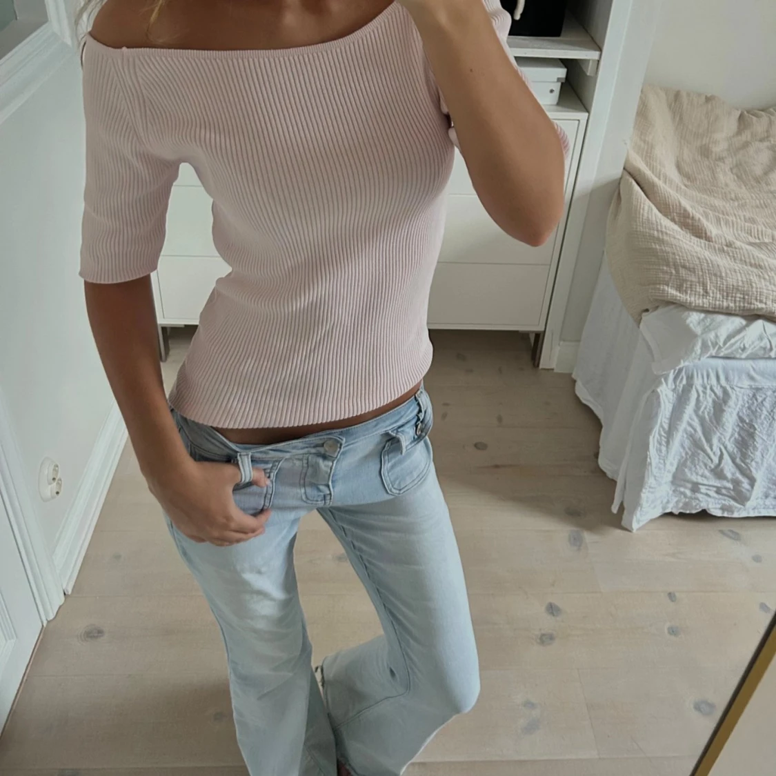 Säljer en ljusrosa ribbad topp med offshoulder-design och halvlånga ärmar. Toppen har en tight passform och är tillverkad i ett mjukt, stretchigt material som sitter snyggt på kroppen. Perfekt för dig som gillar en stilren och feminin look.