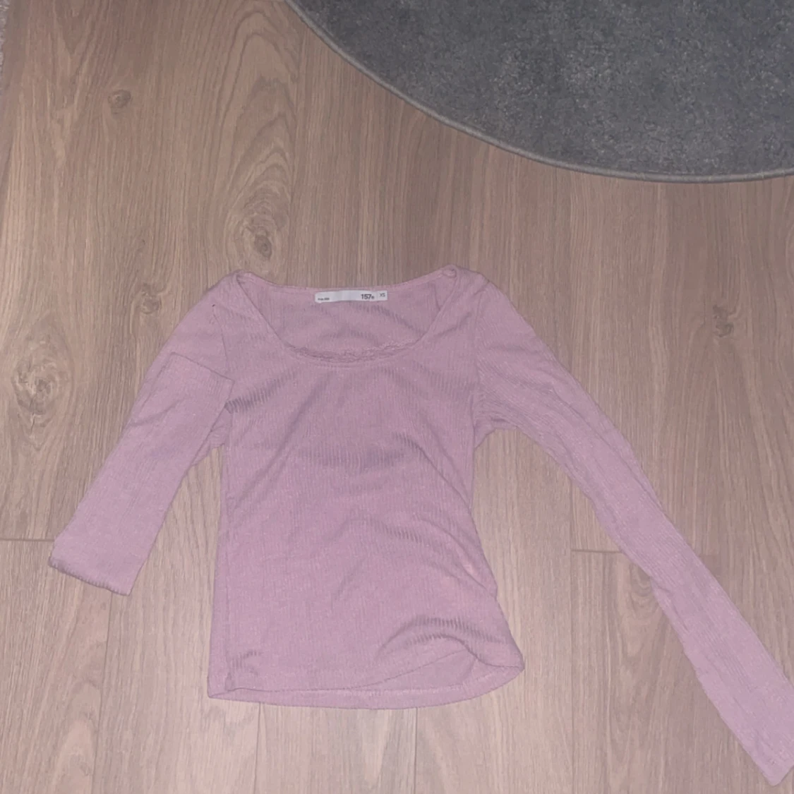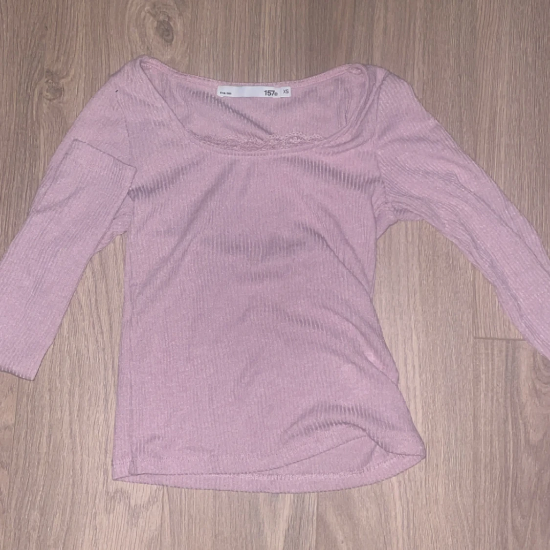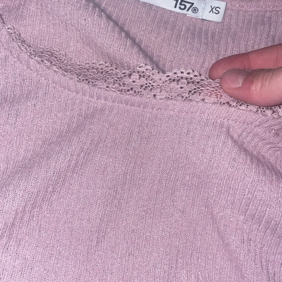 Säljer en ljusrosa ribbad långärmad topp från 157 med trekvartsärm och fin spetsdetalj vid ringningen. Toppen har en feminin och enkel design som passar perfekt till många olika outfits. Använd runt 3 gånger o säljer då den är för liten. Sitter väldigt tajt, som en xxs.