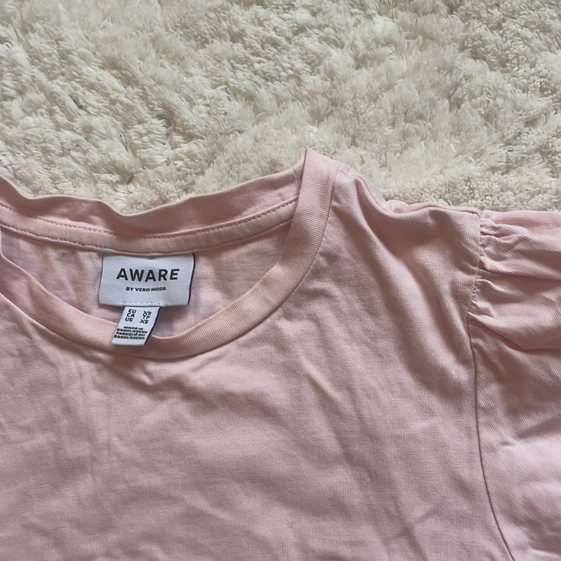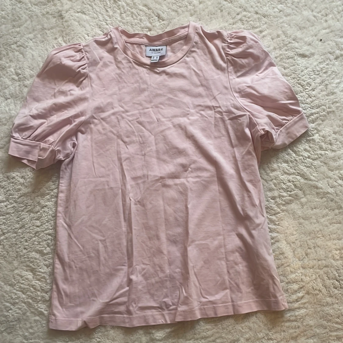 Säljer en ljusrosa topp från Aware by Vero Moda. Toppen har korta puffärmar och rund halsringning. Perfekt för dig som gillar en enkel men söt stil.