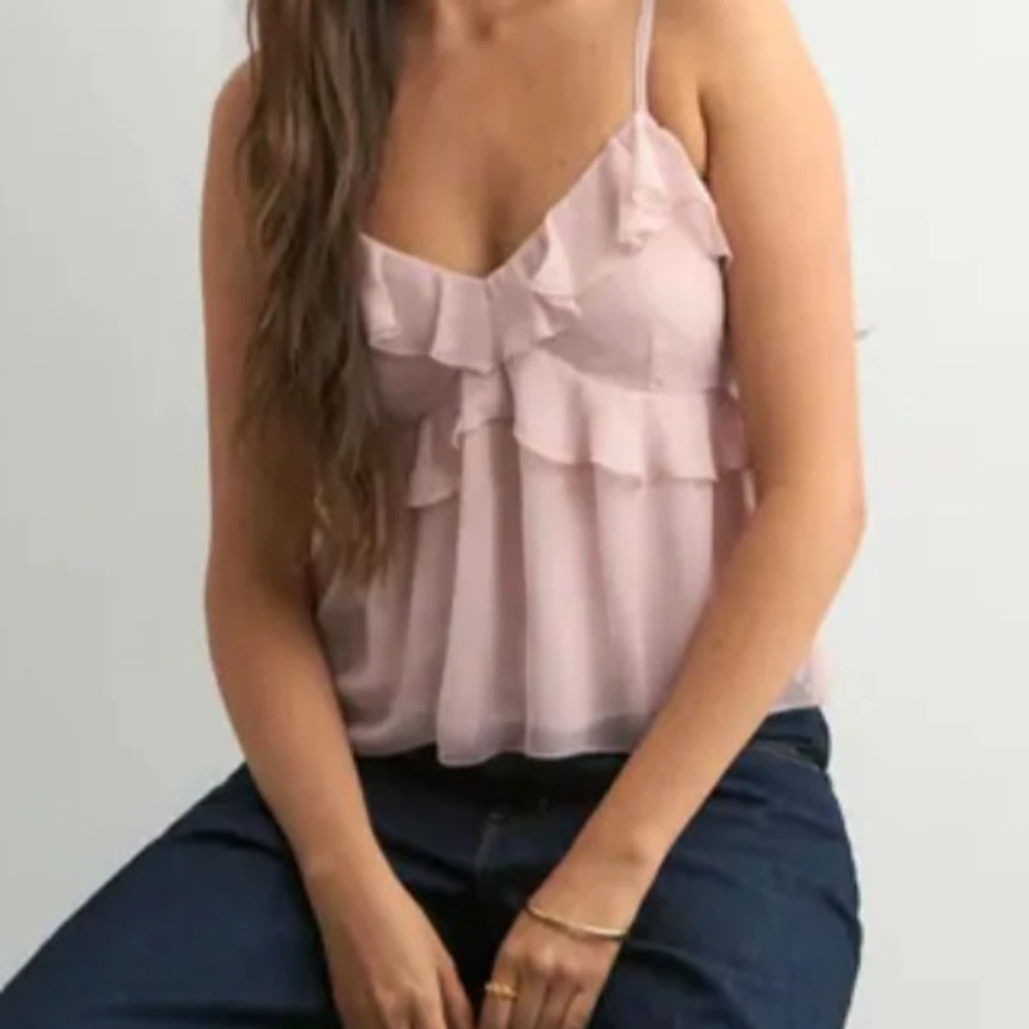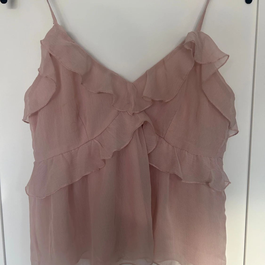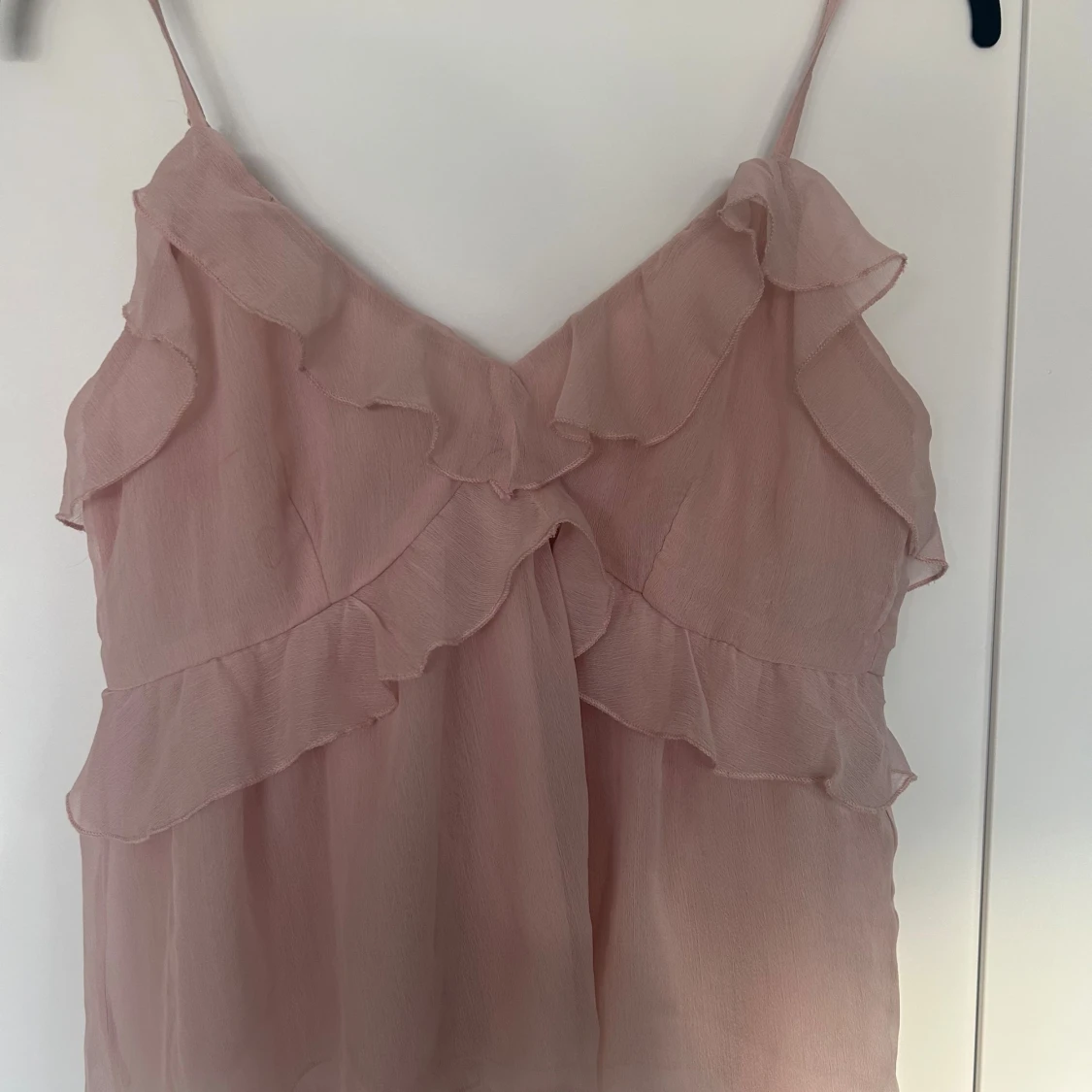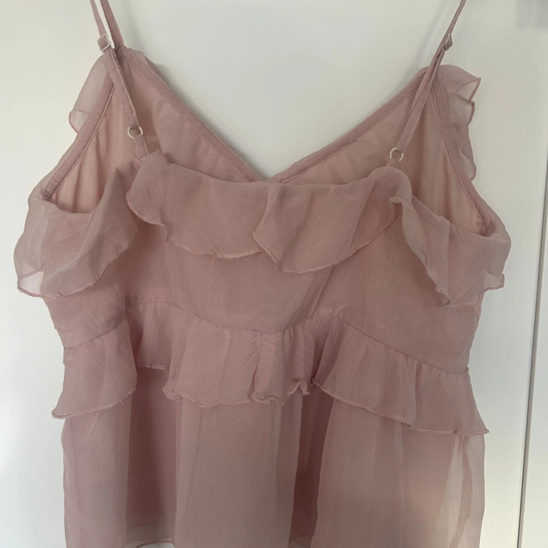Supersöt ljusrosa linnetopp med tunna axelband och flera lager volanger framtill. Toppen har en v-ringad hals och är tillverkad i ett lätt, transparent syntetmaterial som ger en flowy känsla. Perfekt för dig som gillar romantiska och feminina detaljer. Använd ca 2 ggr