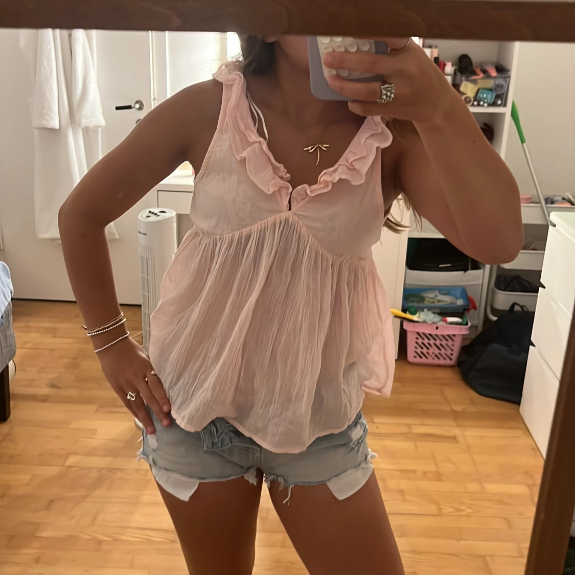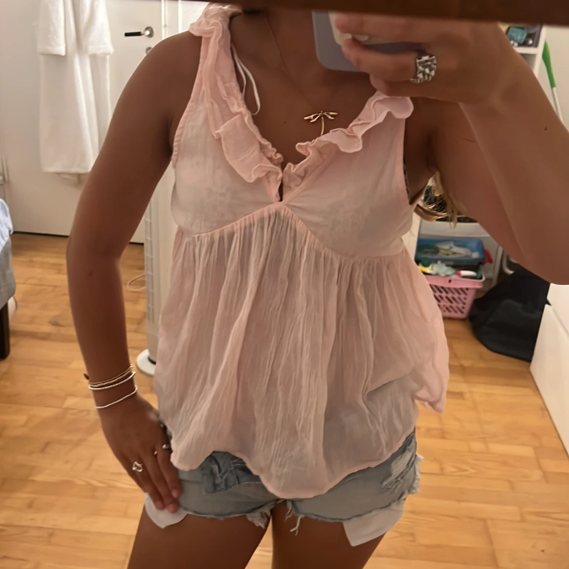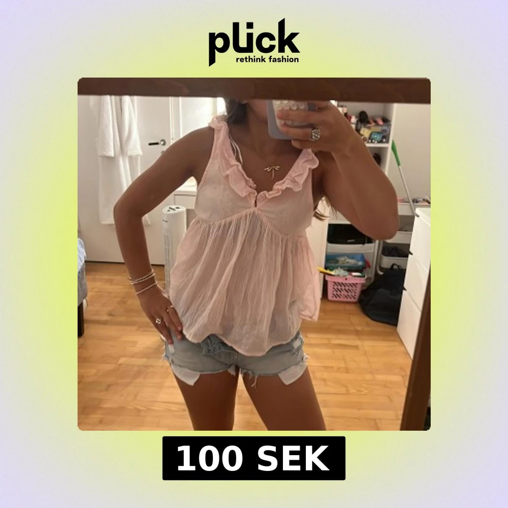 Supersöt ljusrosa blus med volangkant vid v-ringningen och luftig, flowy passform. Ärmlös modell i tunt, skrynkligt bomullstyg som känns perfekt för varma dagar. Ger en romantisk och chill vibe till din outfit. Säljer den i storlek 170 men den passar även xs💞