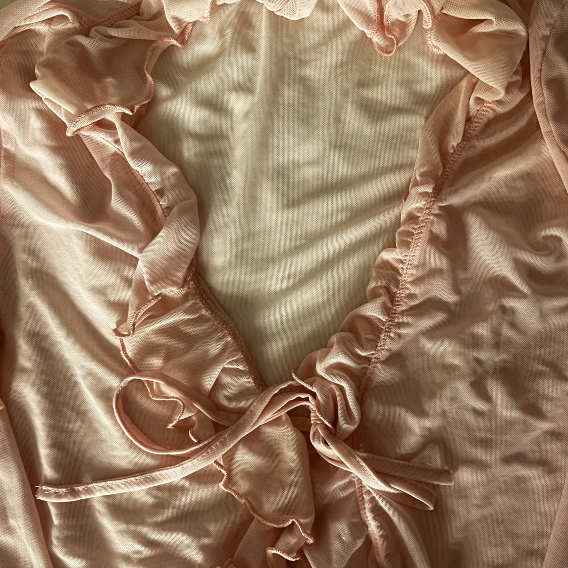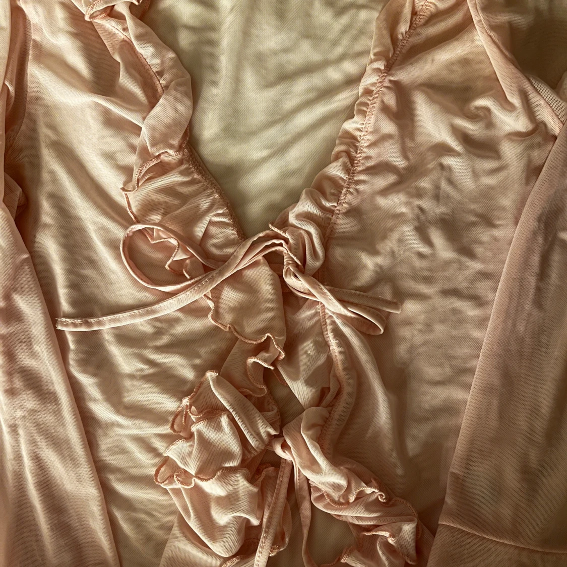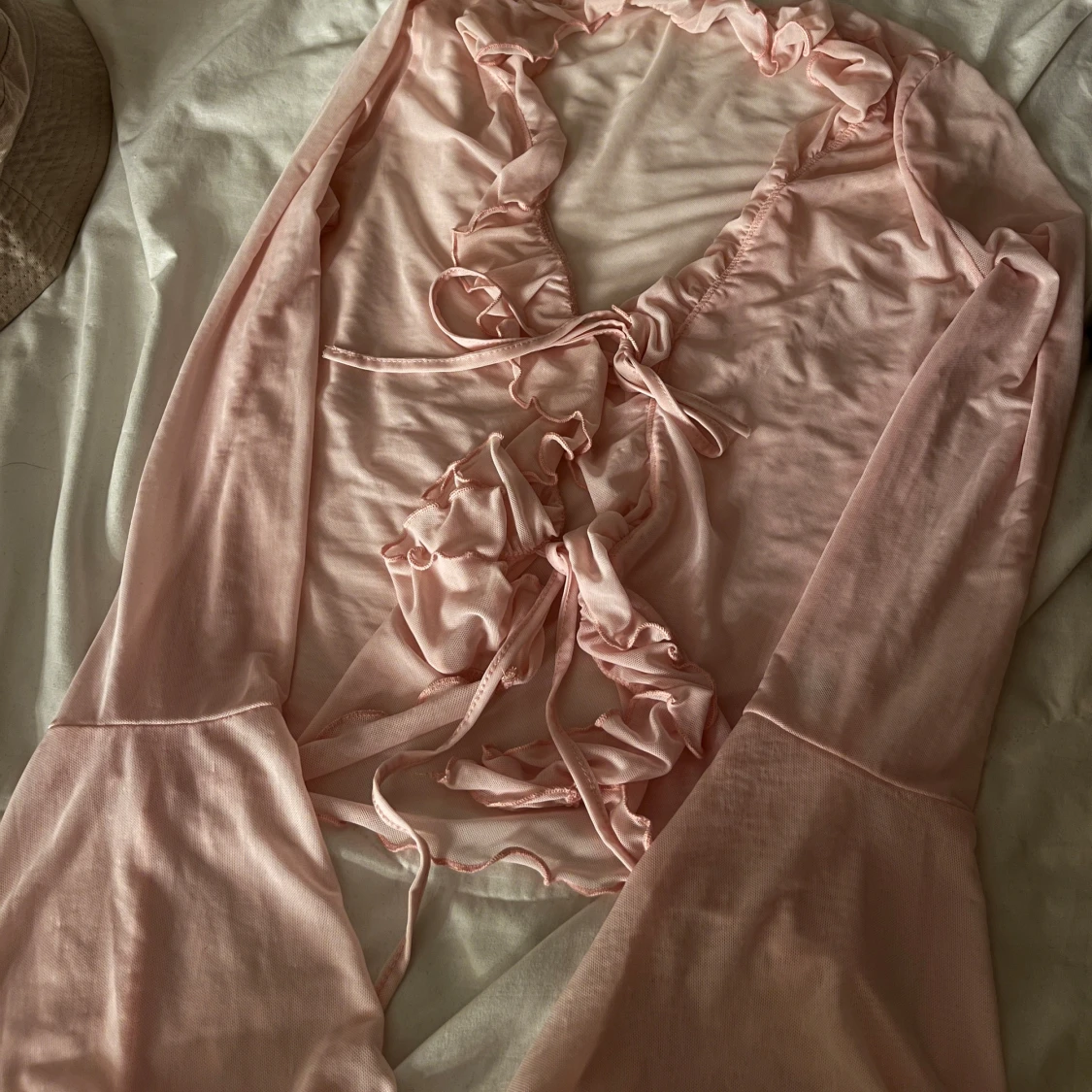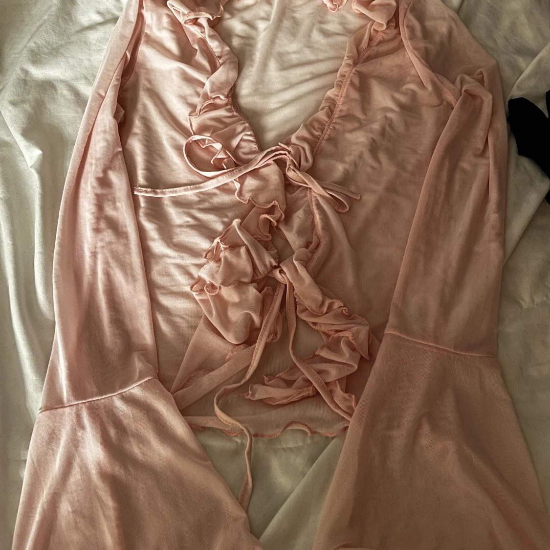 Säljer en favorit ljusrosa topp med volangdetaljer och knyt framtill. Väldigt feminin och vacker, Toppen har långa ärmar och är tillverkad i ett tunt, mjukt material.