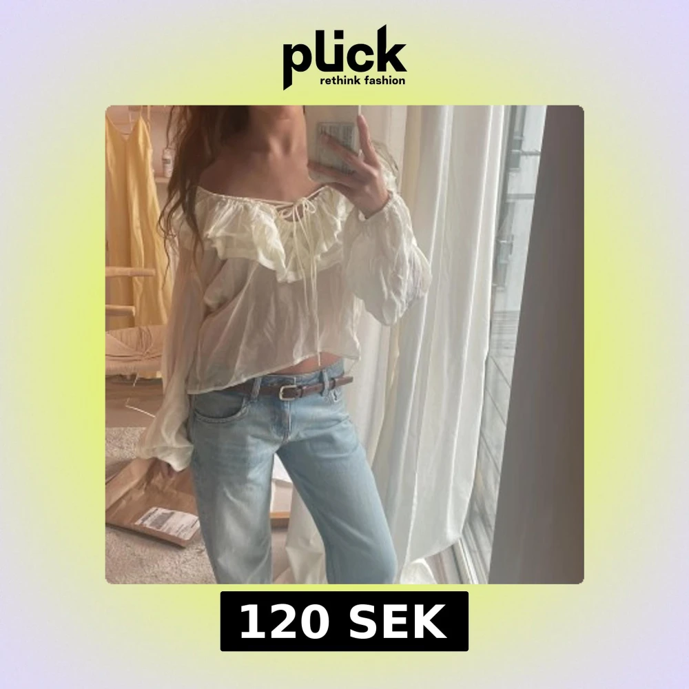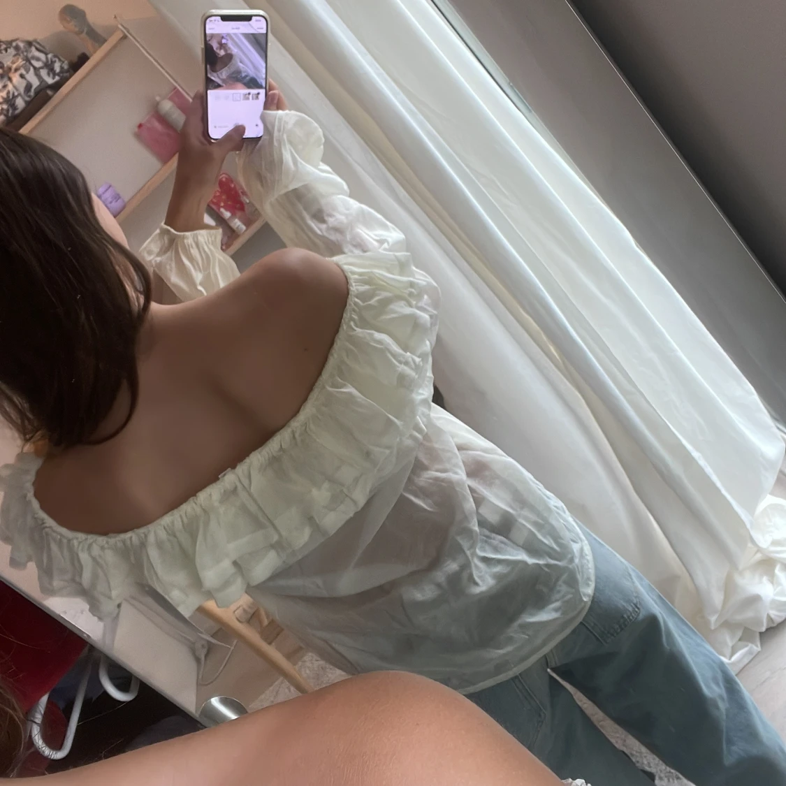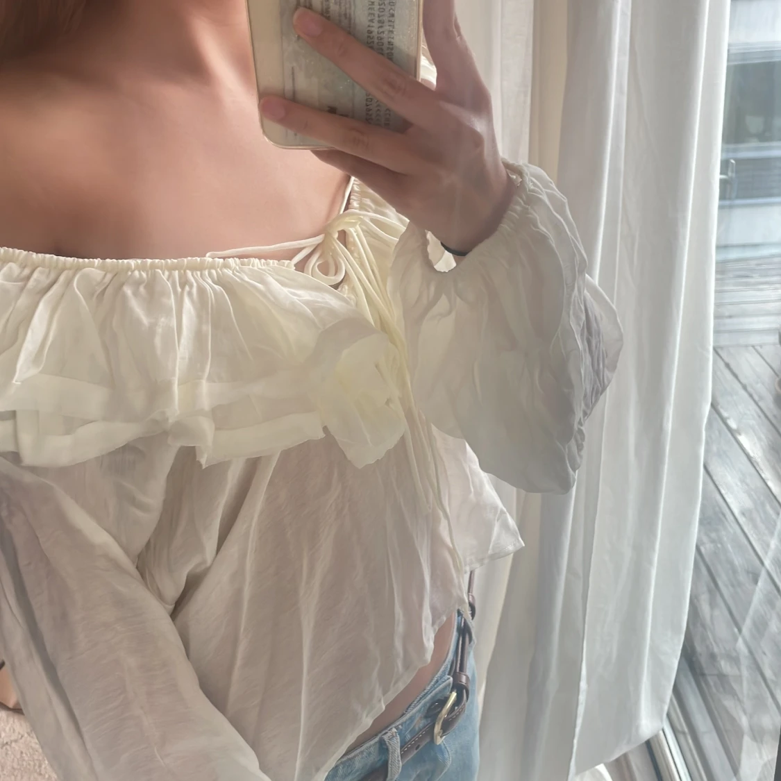 Superfin vit blus i tunn, luftig bomull med offshoulder-modell och bred volang runt hela ringningen. Blusen har långa ärmar med resår vid handlederna och knyt framtill. Perfekt för en romantisk och trendig look. Skriv gärna om du har någon fundering!!