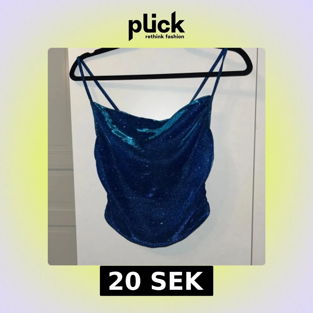 Supersnygg blå glittrig linne från SHEIN med tunna axelband och draperad urringning. Toppen har en croppad passform och cool öppen detalj i ryggen med korsade band. Perfekt för dig som vill sticka ut med lite extra glitter.