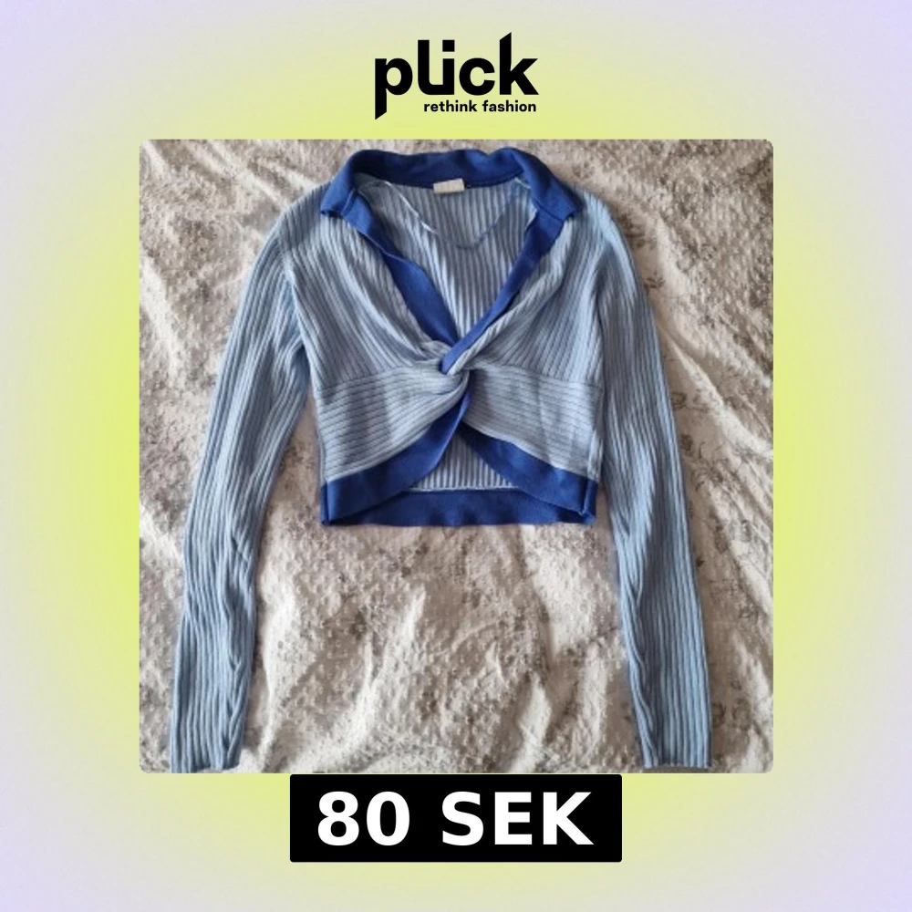 Supersnygg croppad tröja i ljusblått med mörkblå detaljer. Toppen är ribbstickad, har lång ärm och en twistad omlottfront. Aldrig använd.