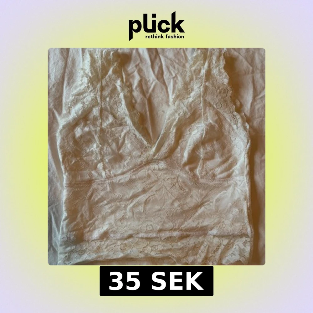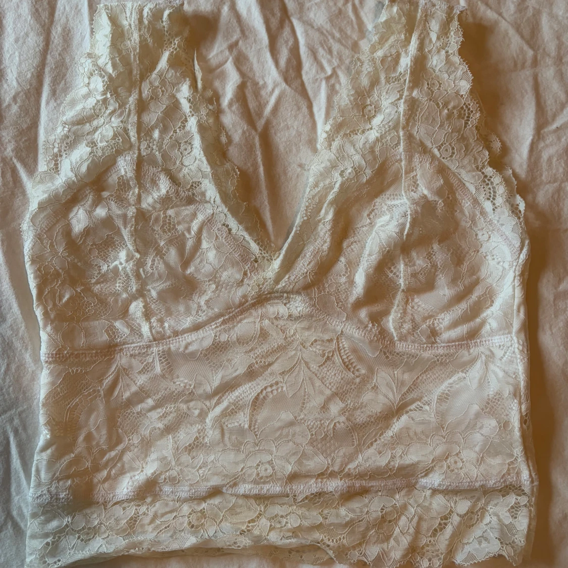 Säljer en vacker vit spetslinne med v-ringad design. Toppen är ärmlös och har ett fint blommigt mönster i spetsen. Perfekt för att lägga till en romantisk touch till din outfit.