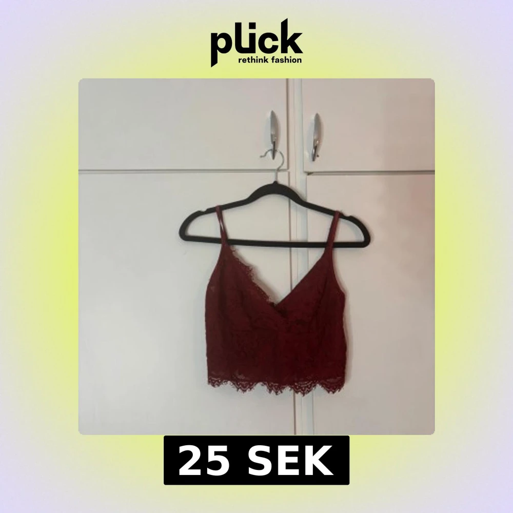 Säljer en vinröd croppad linnetopp köpt på New Yorker med blommig spets och smala axelband. Toppen har v-ringning och dragkedja i ryggen för en snygg detalj. Storlek M men den är ganska liten i storlek så skulle säga att det mer är en XS eller S. Använd några fåtal gåner