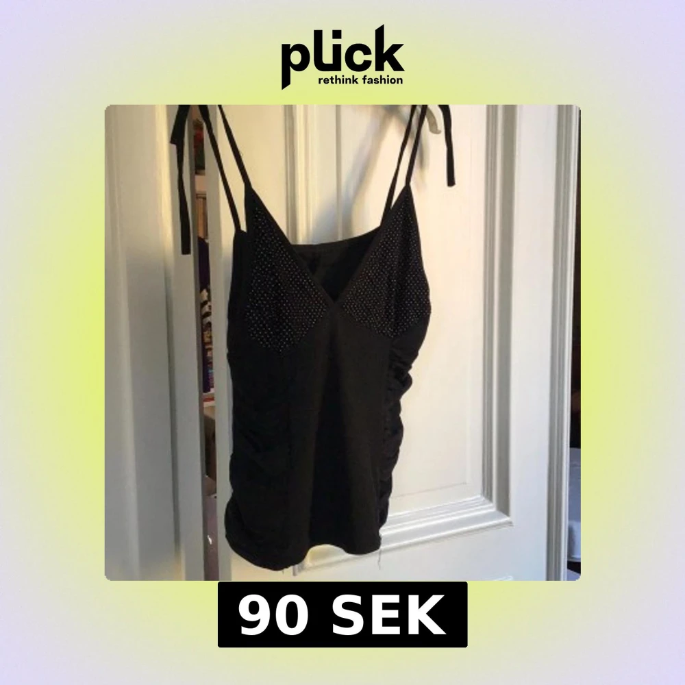 Snyggt svart linne med knytband på axlarna och glittriga detaljer vid bysten. Linnet har en åtsittande passform med rynkade sidor som ger en fin siluett. Perfekt för en kväll ute eller en speciell tillställning.