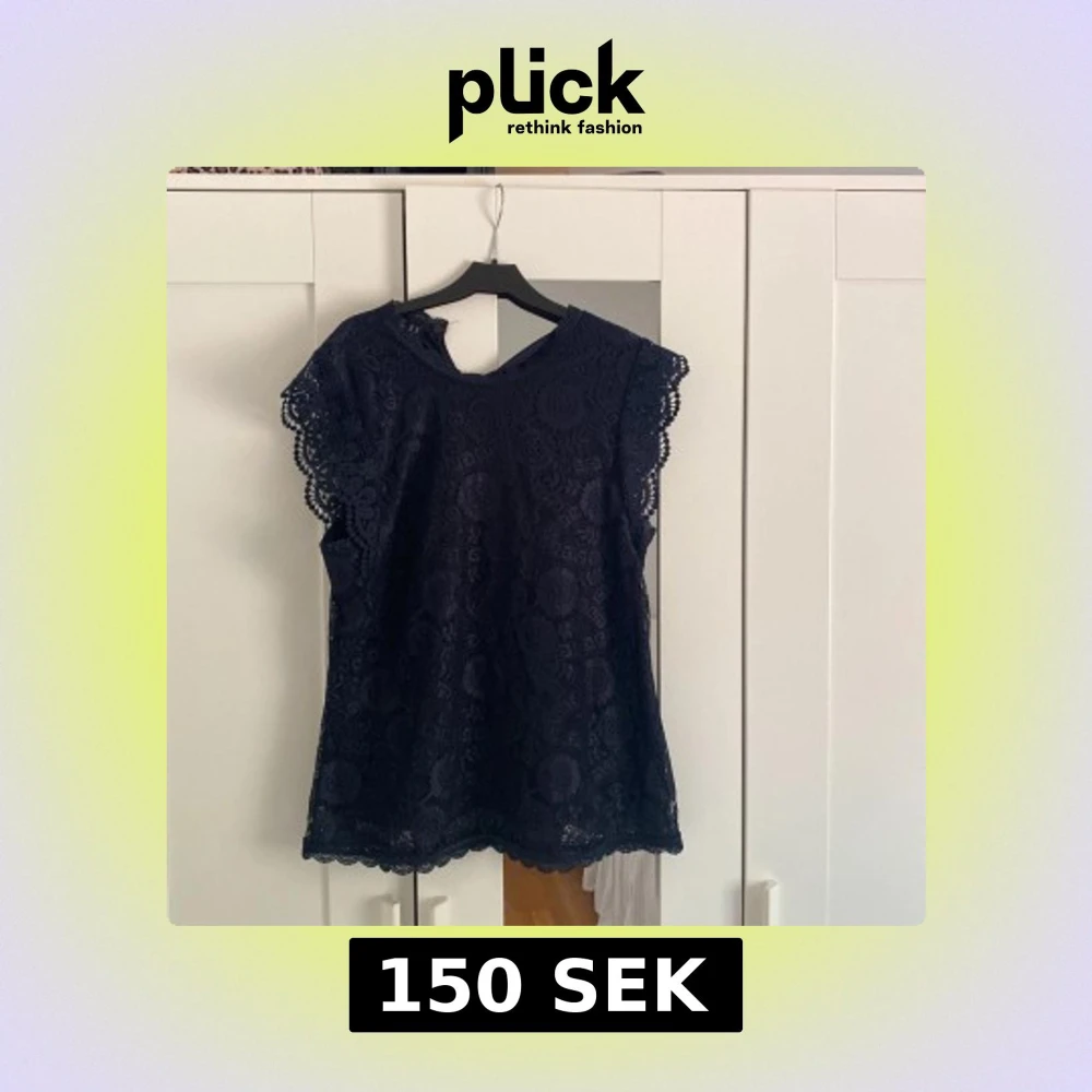 Supersnygg mörkblå blus i spets med vackra broderade mönster och vågiga kanter vid ärmar och nederkant. Ärmlös modell som ger en elegant och trendig look.