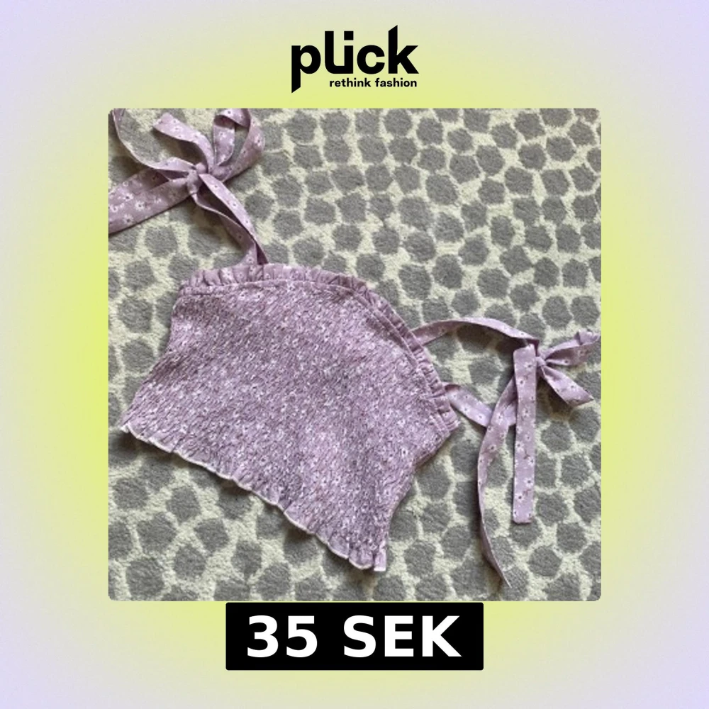 Supersöt bandeau topp i ljuslila med små vita blommor och smockad struktur. Axelbandslös modell med breda band som knyts på axlarna för extra gullig vibe. Perfekt för varma dagar och ger en riktigt somrig känsla. Passar mer som xs-s.
