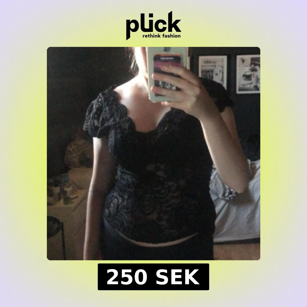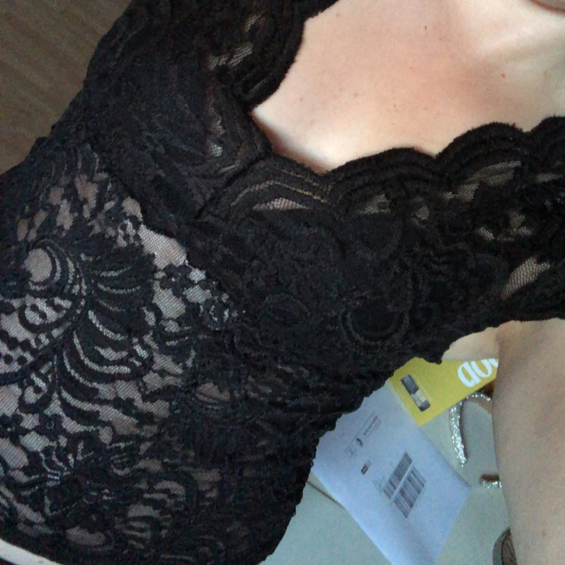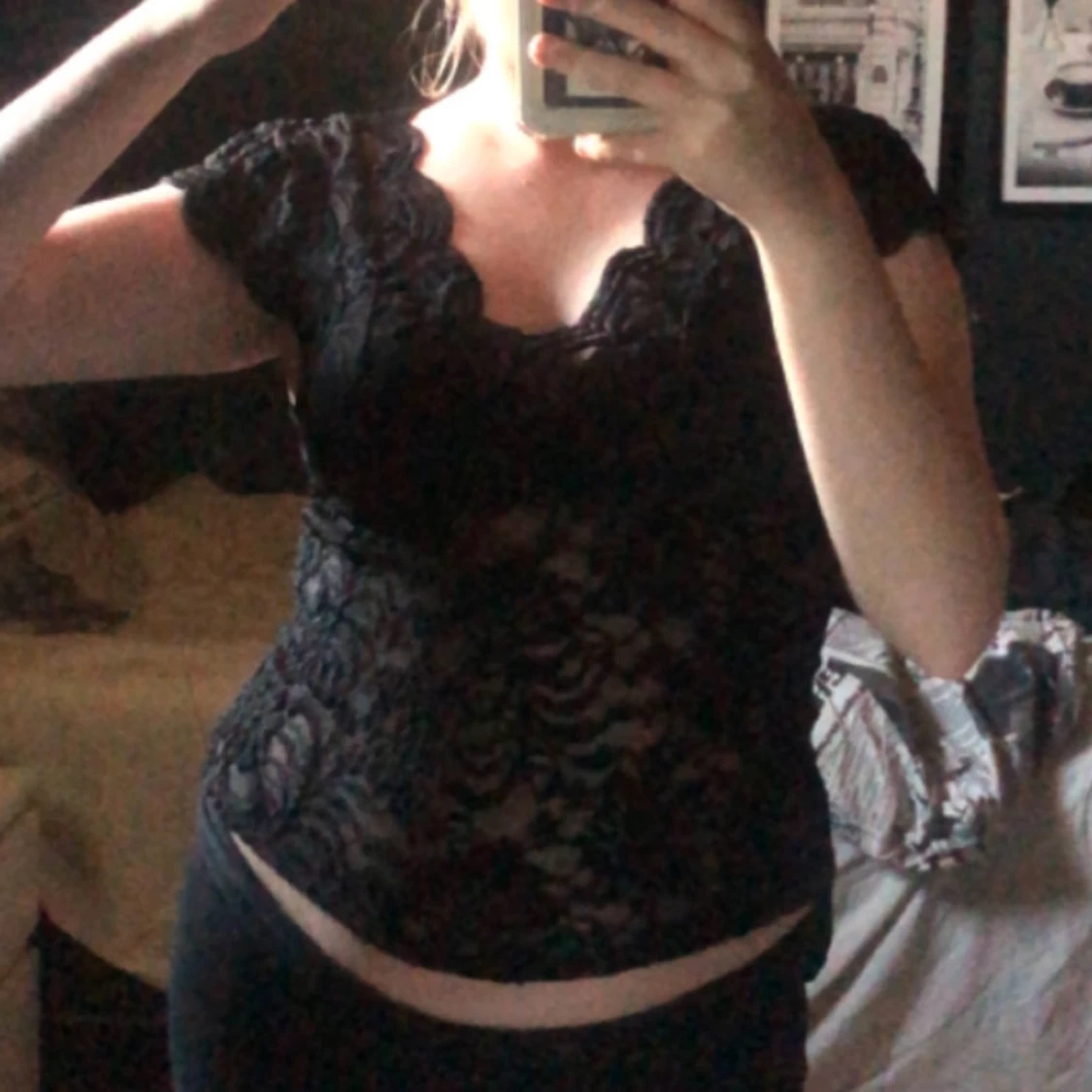 Supersnygg svart blus i spets med v-ringad hals och korta ärmar. Blusen har ett genombrutet mönster och scallop-kant vid halsen. Perfekt för dig som vill ha en feminin och trendig look med lite edge.
