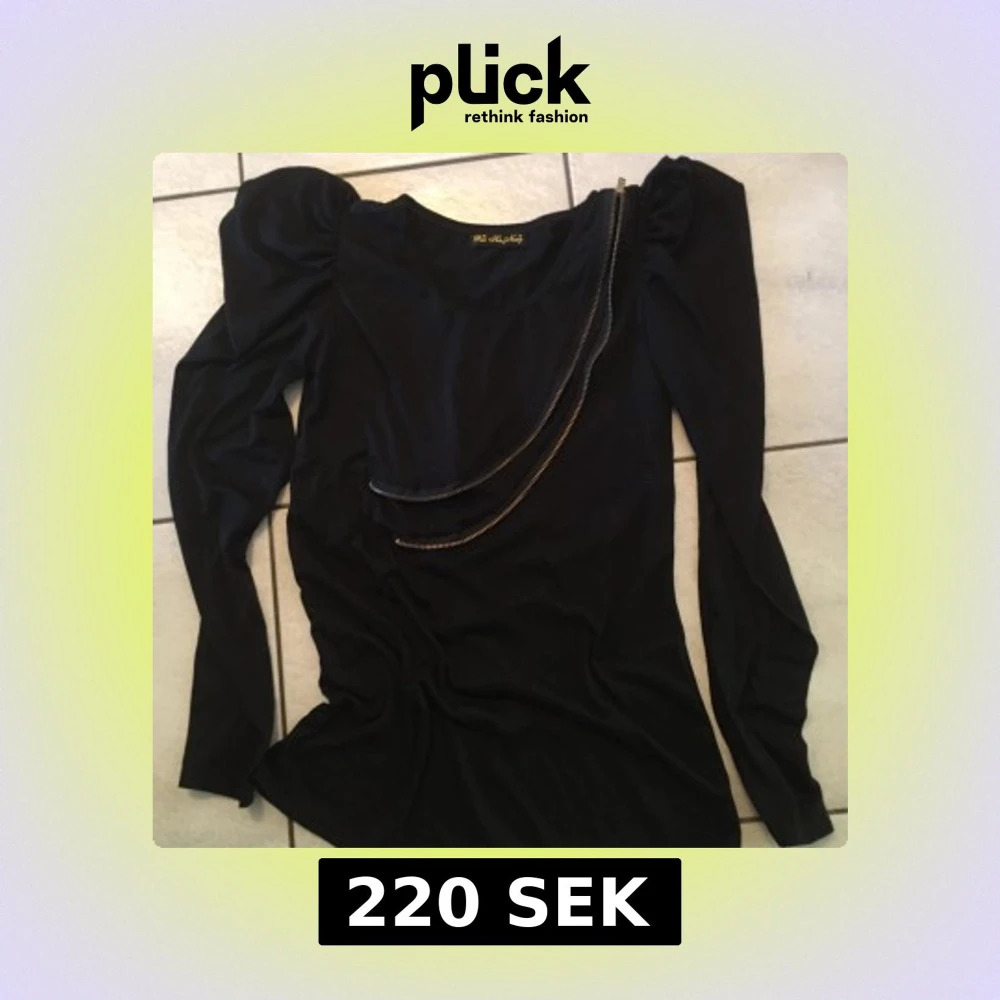 Snygg svart långärmad topp med unik dragkedjedetalj över bröstet. Perfekt för en trendig look med puffiga axlar som ger extra stil. Passar bra till både jeans och kjol.