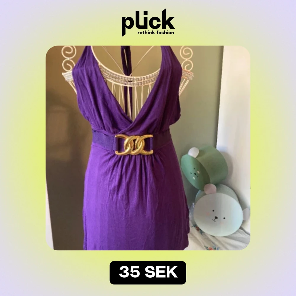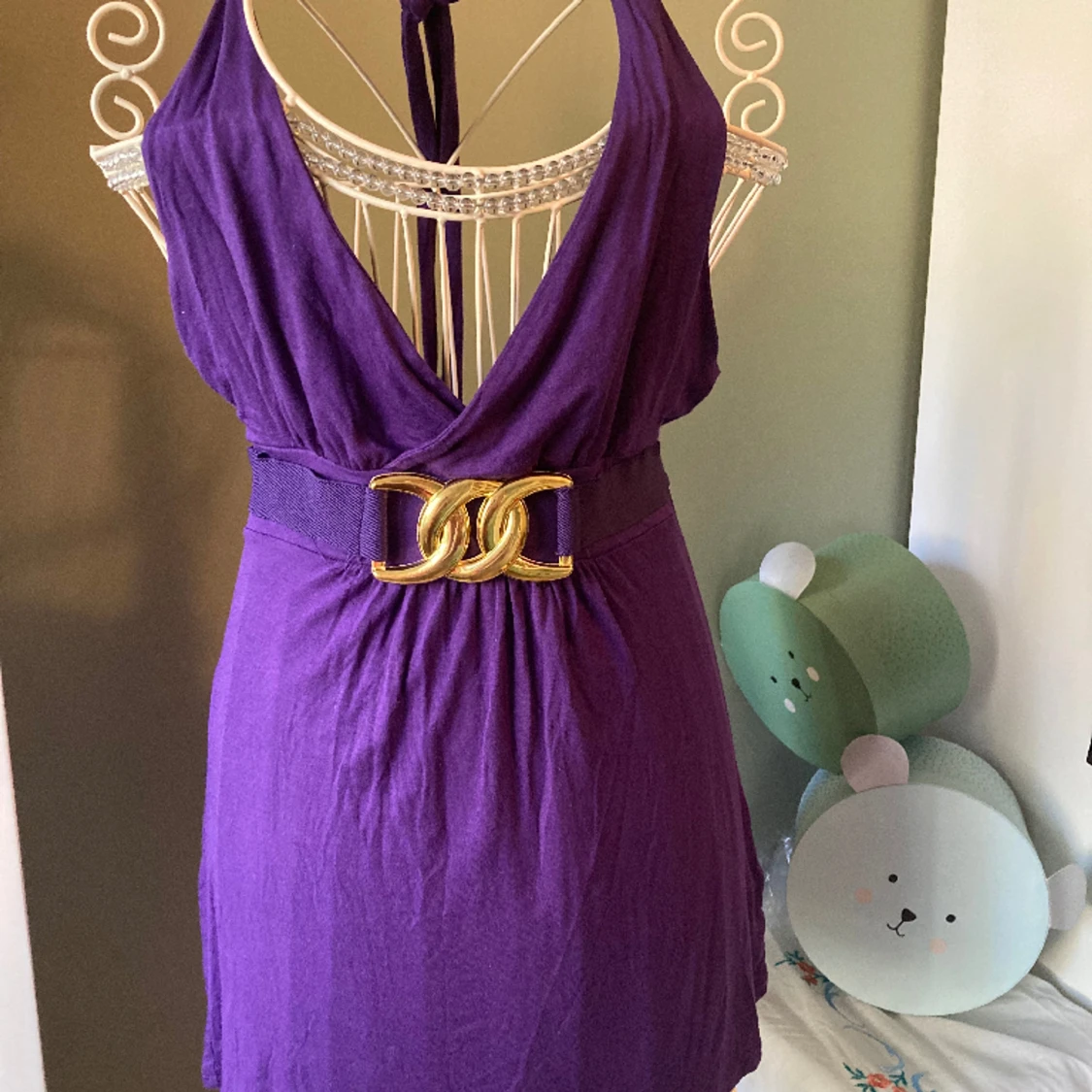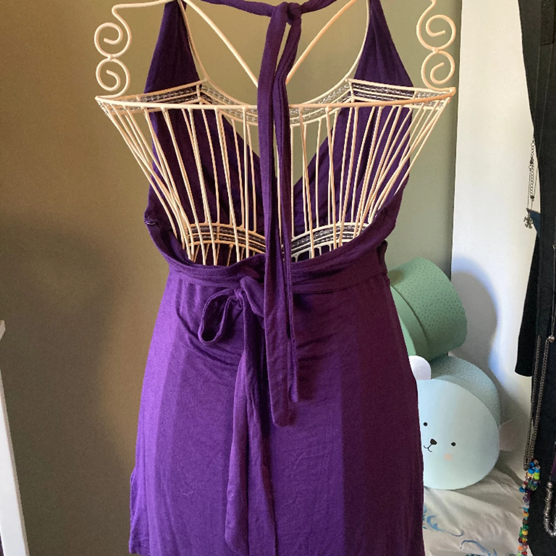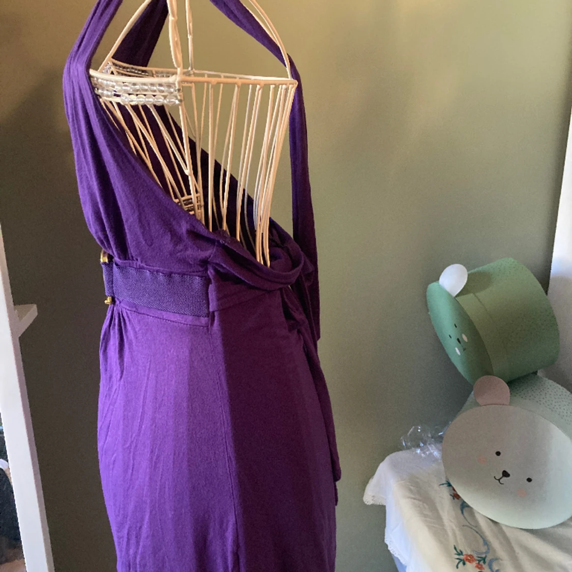 Fint skick. Knytband både till halterneck och för att justera i midjan. Underbar mörklila färg med ”guldspänne”.