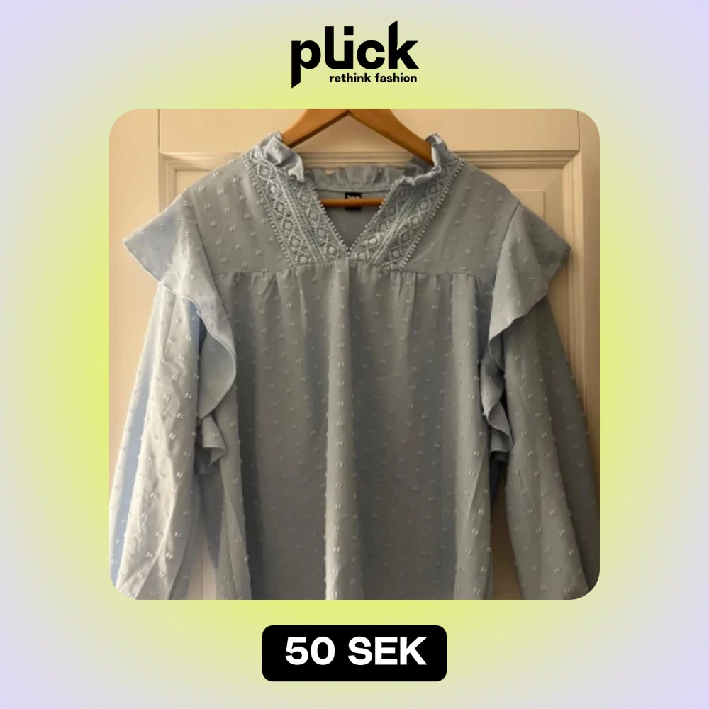 Säljer en superfin ljusblå blus från Sensity. Den har vackra spetsdetaljer vid halsen och volanger längs ärmarna. Blusen är långärmad och har ett diskret prickigt mönster. Perfekt för både vardag och fest!