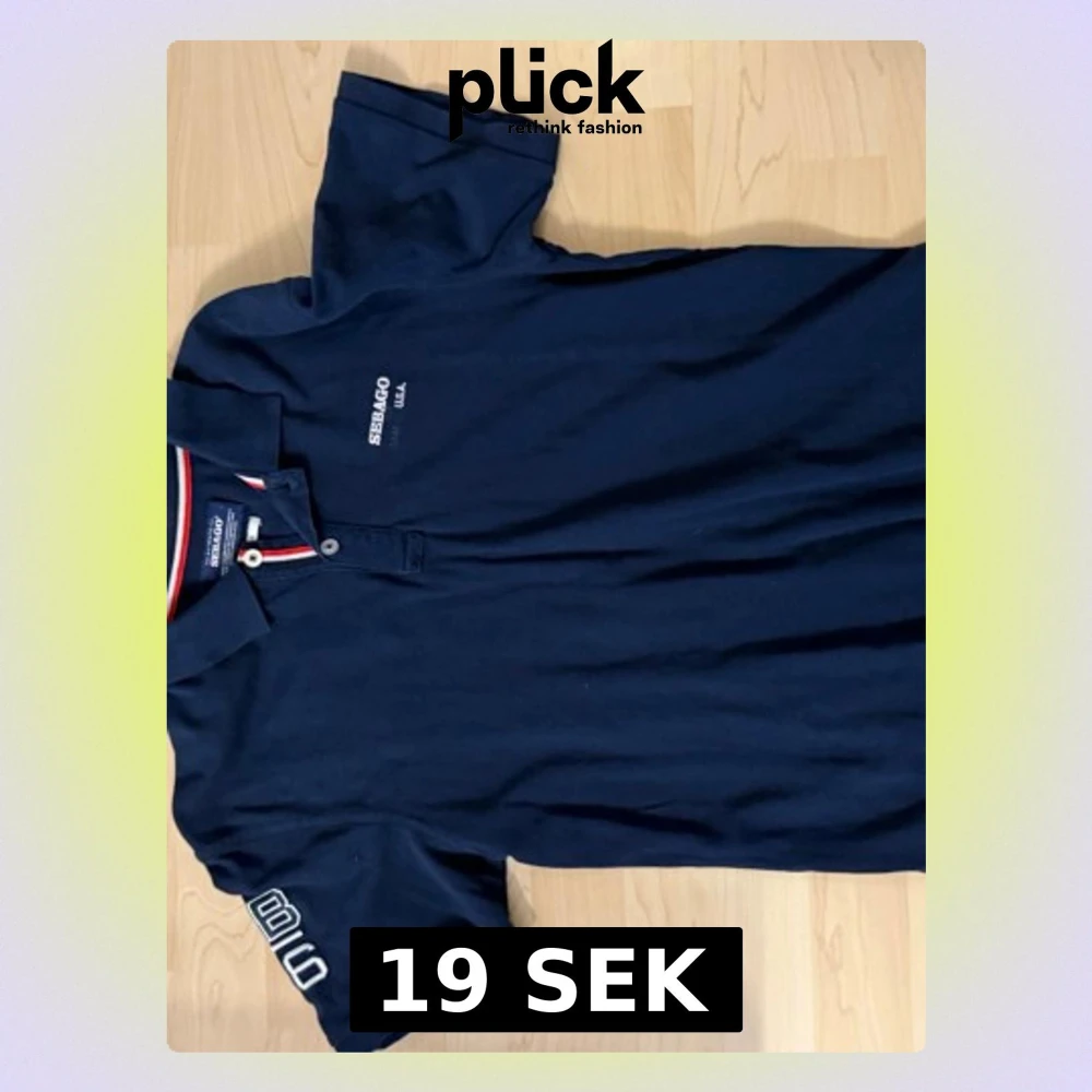 Snygg marinblå pikétröja från Sebago med vit logga på bröstet och ärmen. Kragen har röd, vit och marinblå randig detalj. Klassisk passform och korta ärmar, perfekt till jeans eller shorts.