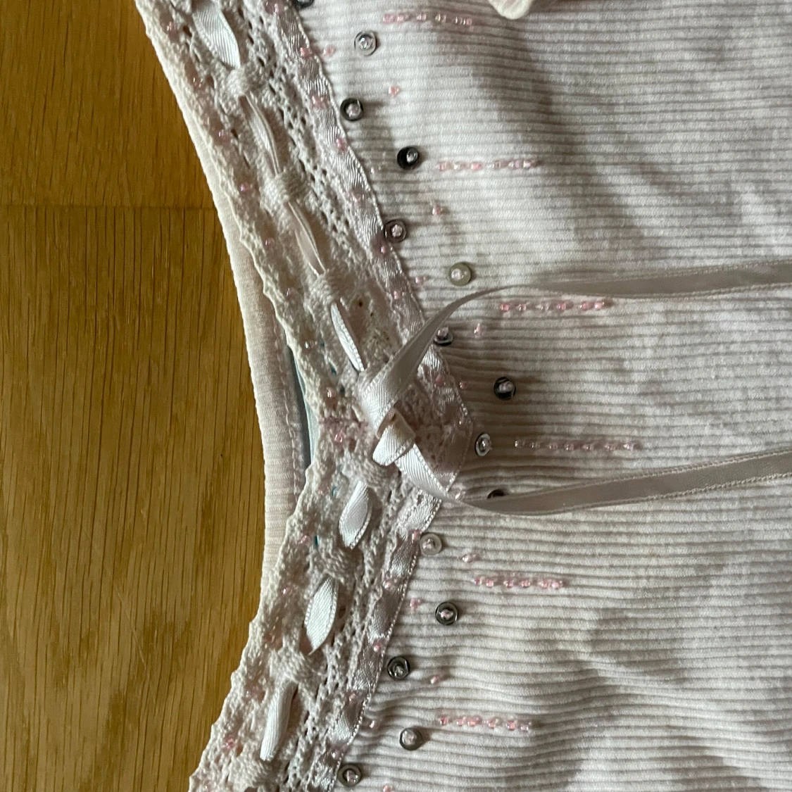 Säljer en söt vit ribbad linnetopp med spetsdetaljer och små knappar framtill. Toppen har smala axelband och en dekorativ snörning vid halsringningen. Perfekt för varma sommardagar!