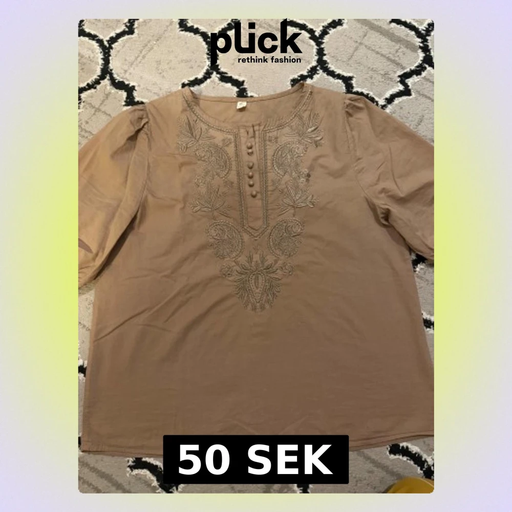 Säljer en beige blus från OZOC med broderade detaljer framtill och dekorativa knappar vid halsringningen. Blusen har puffiga trekvartsärmar och är tillverkad i ett tunt bomullstyg. Perfekt för dig som gillar boho-vibes och snygga detaljer.