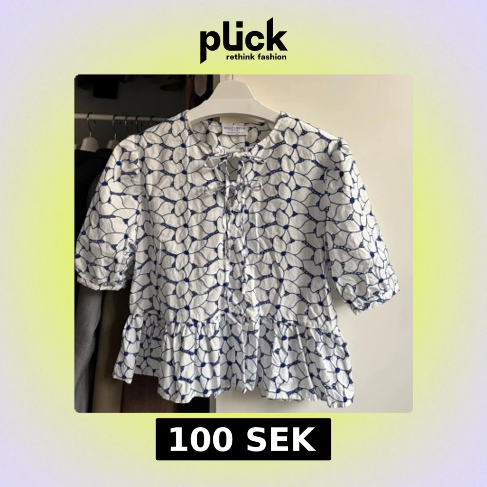 đ€SĂ€ljer en vit blus frĂ„n Holly & Whyte med blĂ„tt blommigt broderat mönster. Blusen har snörning fram, puffiga korta Ă€rmar och en volang nedtill đ€