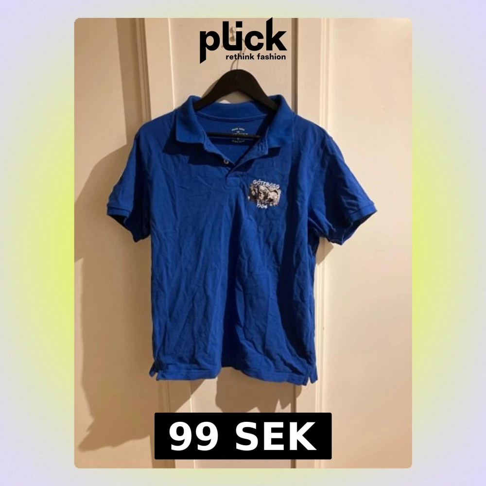 Snygg blå pikétröja med tryck på bröstet där det står 'Göteborg 1904' och en bild på supportrar. Klassisk krage och korta ärmar, perfekt för dig som gillar sportig stil.