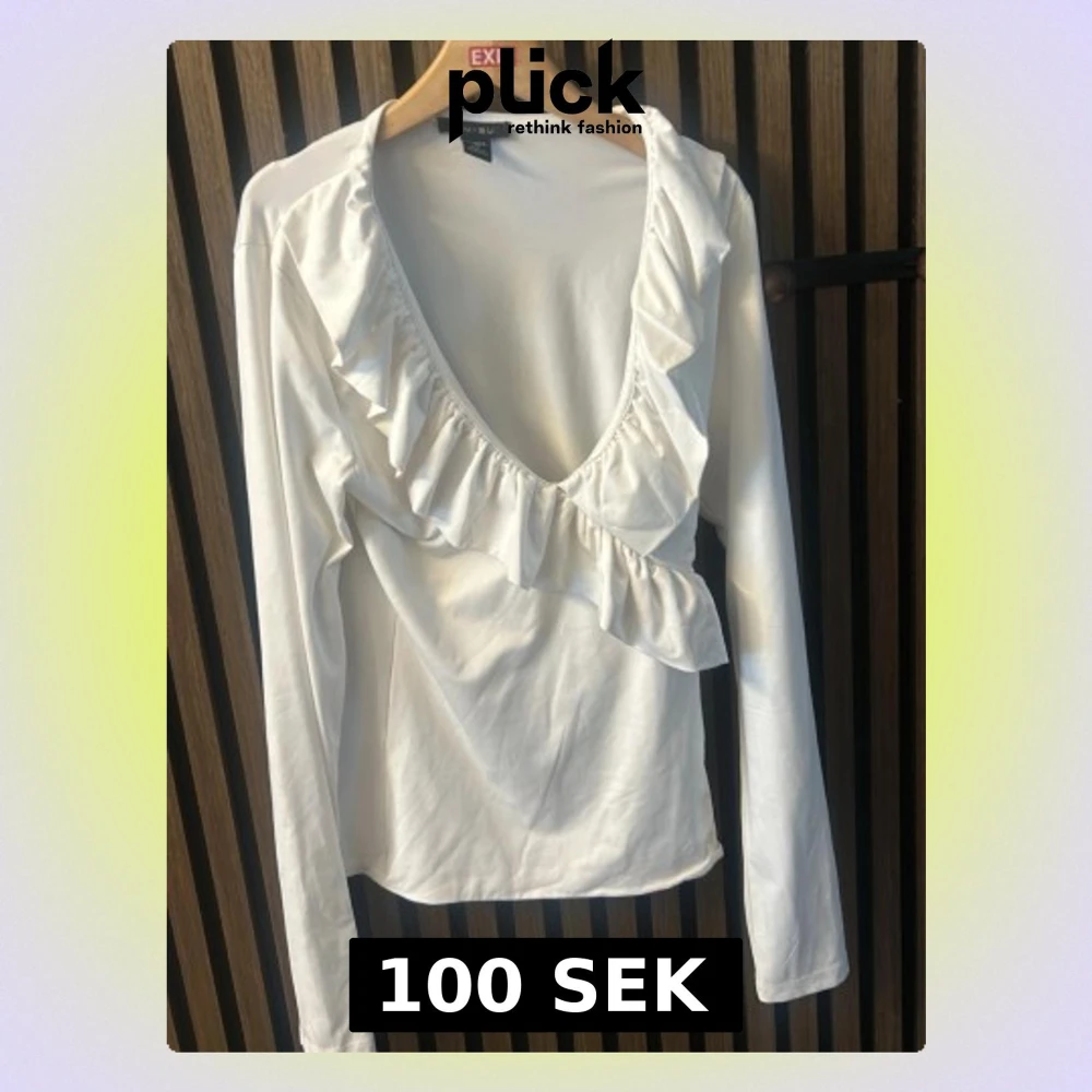 Säljer en vit långärmad topp från Mimius med djup v-ringning och volangdetalj längs ringningen. Toppen har en feminin och trendig look, perfekt att styla med jeans eller kjol. Materialet känns mjukt och följsamt. S-m
