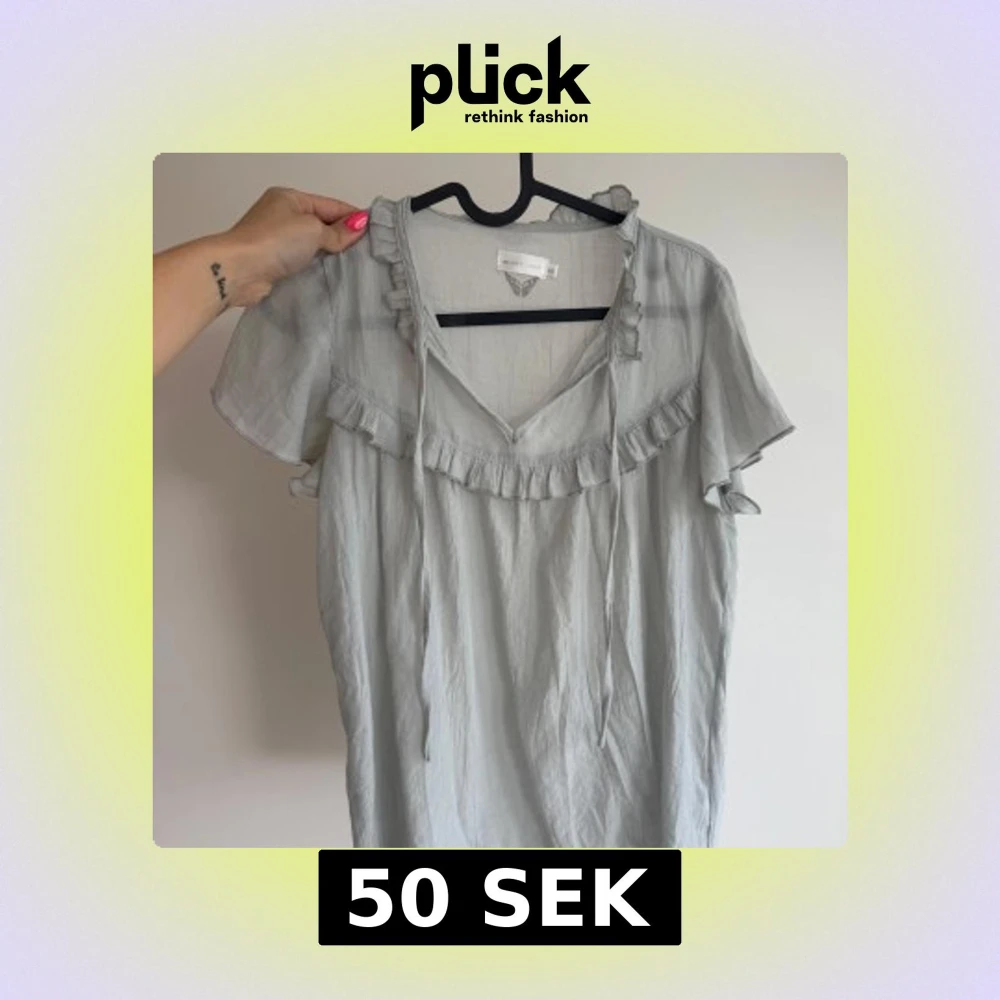 Supersöt ljusgrå blus från Amber & Cloud med volangdetaljer längs v-ringningen och axlarna. Blusen har korta ärmar och knytband vid halsen för extra detalj. Luftigt material som känns skönt mot huden och passar perfekt till jeans.