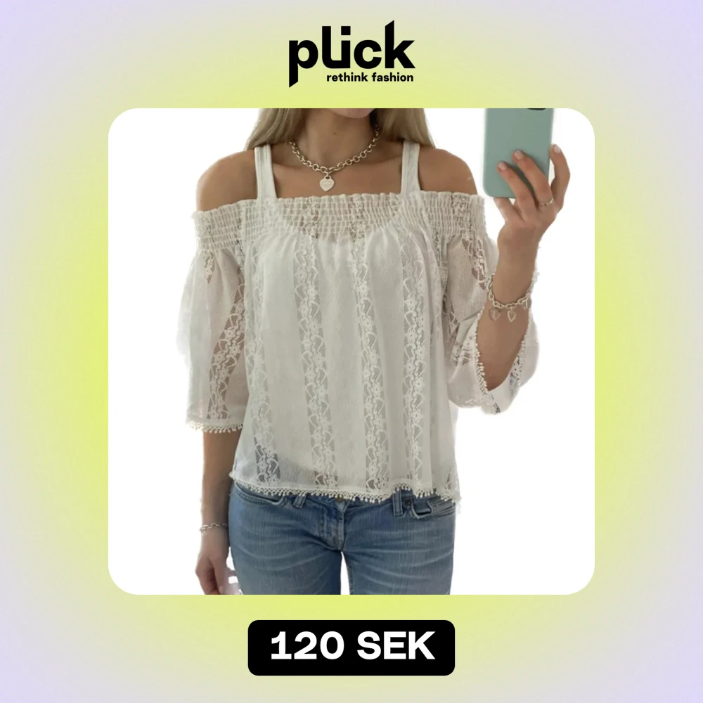 Säljer en superfin vit offshoulder blus med spetsdetaljer. Den har trekvartsärmar och en luftig passform, perfekt för sommardagar. Blusen har en elastisk överdel som ger en bekväm passform och söta spetskanter som ger en romantisk touch. Perfekt för både vardag och fest!