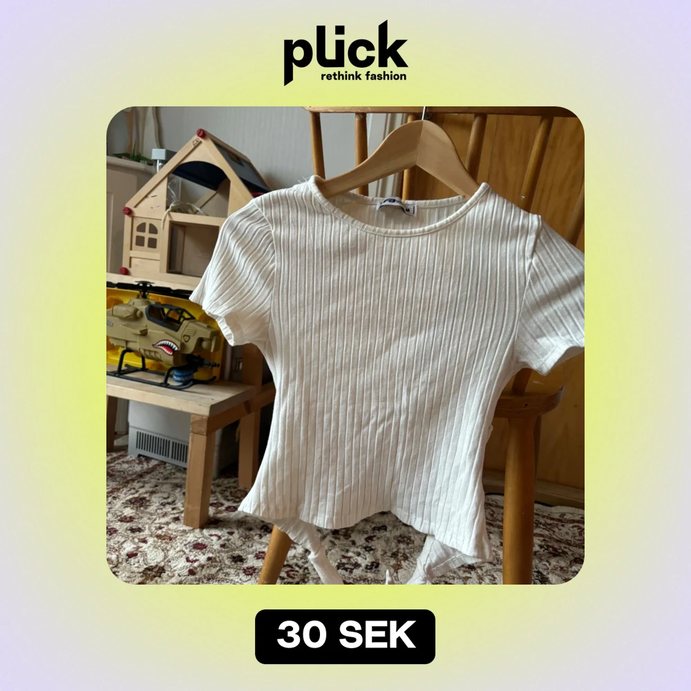 Säljer en superfin vit ribbad topp med korta ärmar. Den har en snygg knytdetalj i nederkanten som ger en cool look. Perfekt för sommardagar eller att styla med en jacka för hösten. Toppen är i bra skick och passar till många olika outfits!