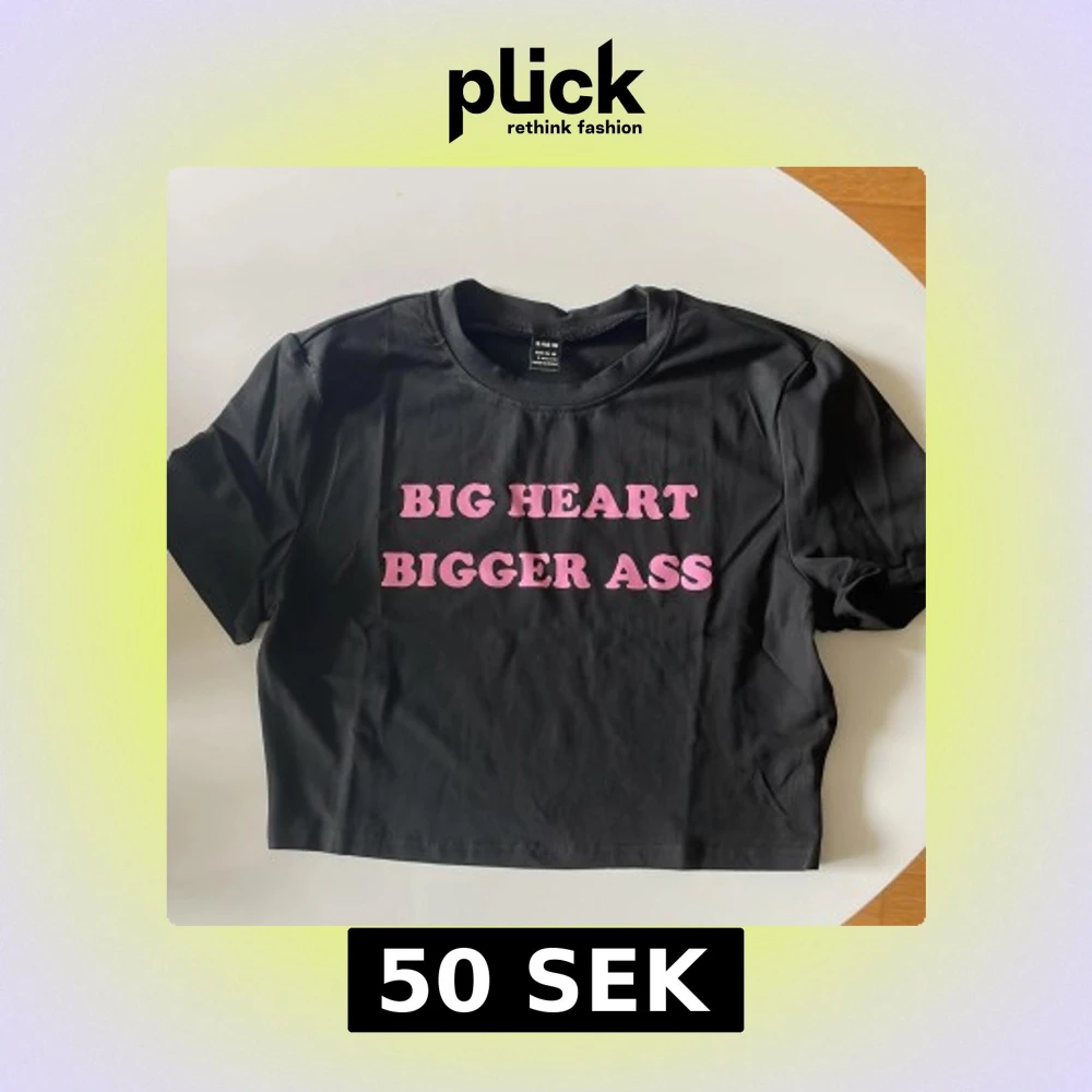 Svart croppad t-shirt från SHEIN med coolt rosa tryck på bröstet där det står 'BIG HEART BIGGER ASS'. T-shirten har korta ärmar och en klassisk rund halsringning. Perfekt för dig som vill sticka ut med ett statement-plagg.