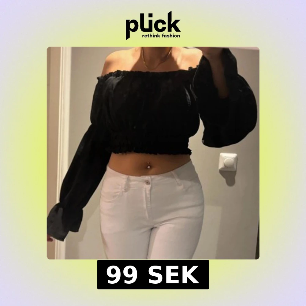 En svart offshoulder blus med vida långa ärmar och smockad resår vid axlar och midja. Toppen är croppad och har en luftig känsla, perfekt för att skapa en trendig look. Älskar denna men används aldrig
