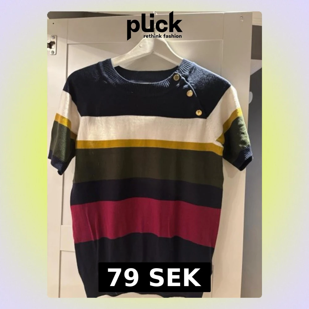 Säljer en snygg randig topp från Holly & Whyte i storlek M. Toppen har breda horisontella ränder i marinblått, vitt, olivgrönt, vinrött och gult. Rund halsringning med tre dekorativa guldfärgade knappar på axeln. Kortärmad och mjukt stickad material.